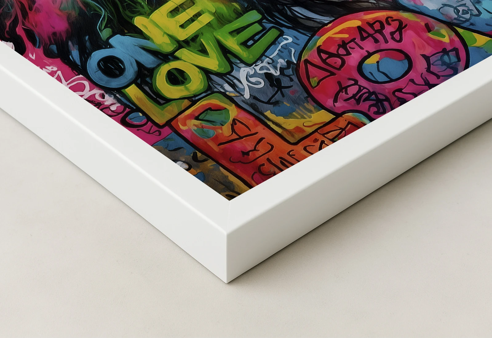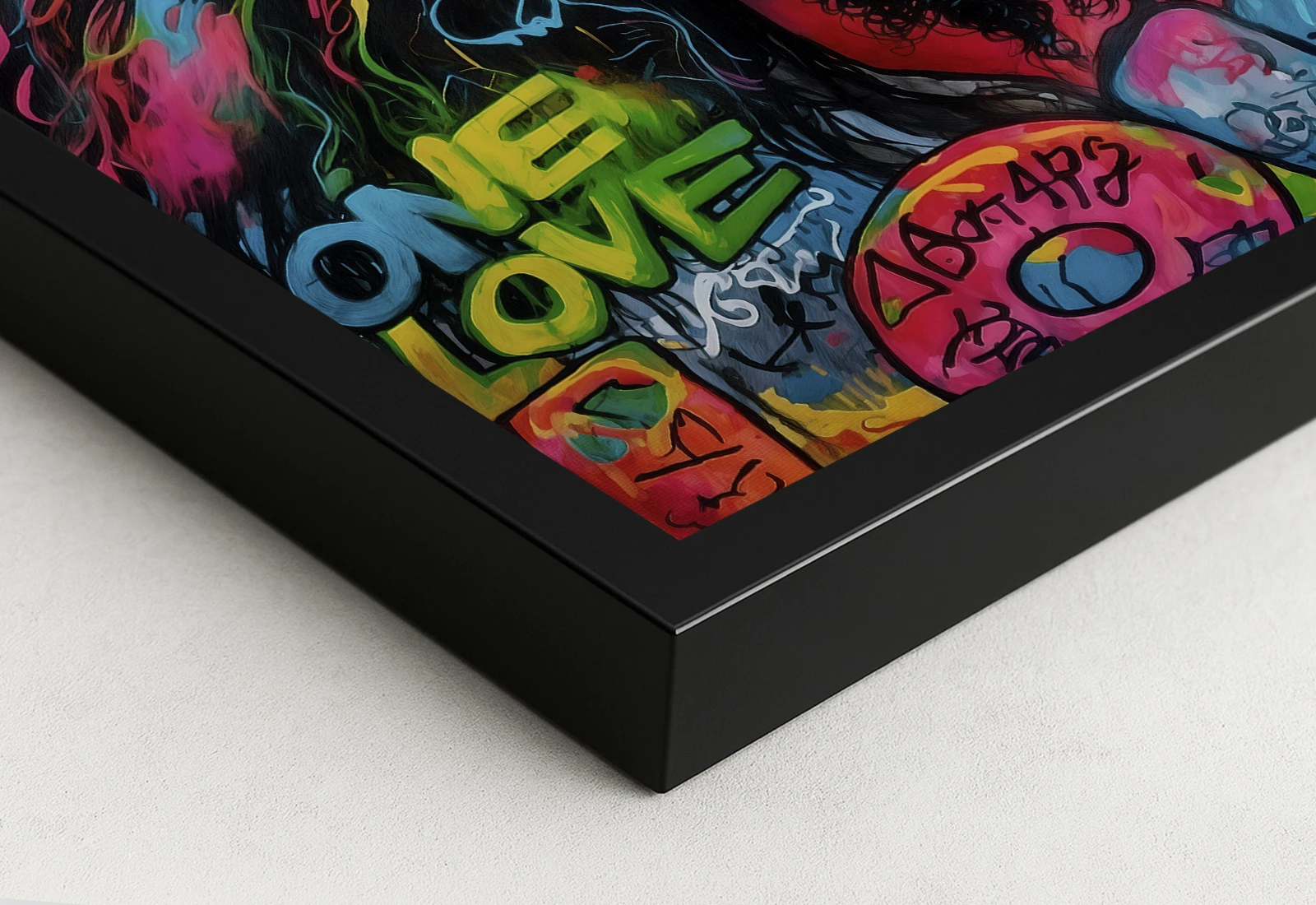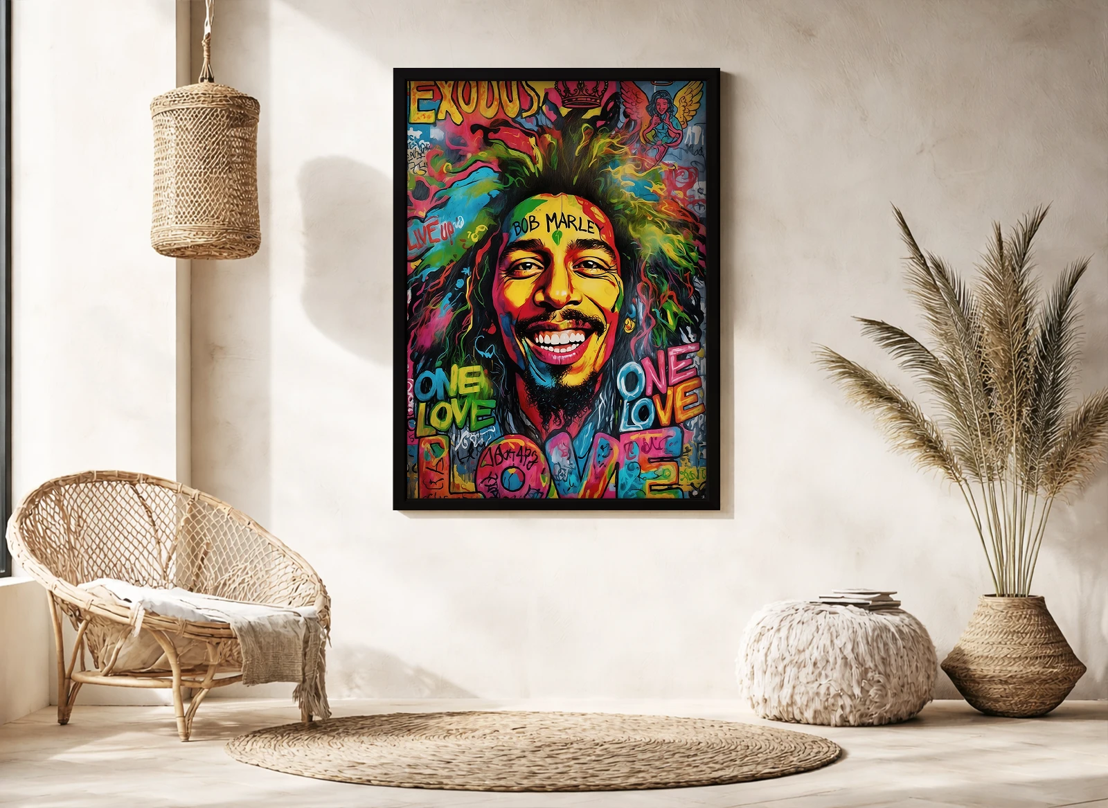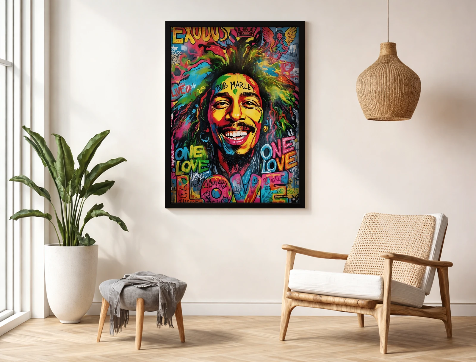 На изображении яркий портрет Боба Марли в насыщенных цветах с граффити и надписями One Love. Контрастные оттенки и детальная проработка лица создают эффект глубины и динамики.