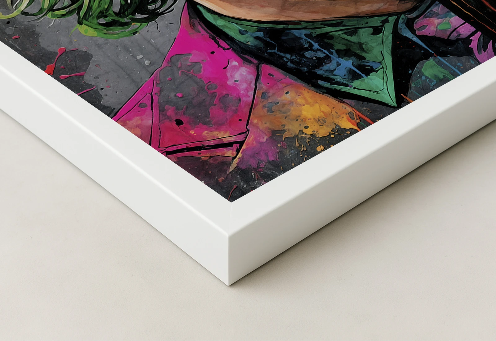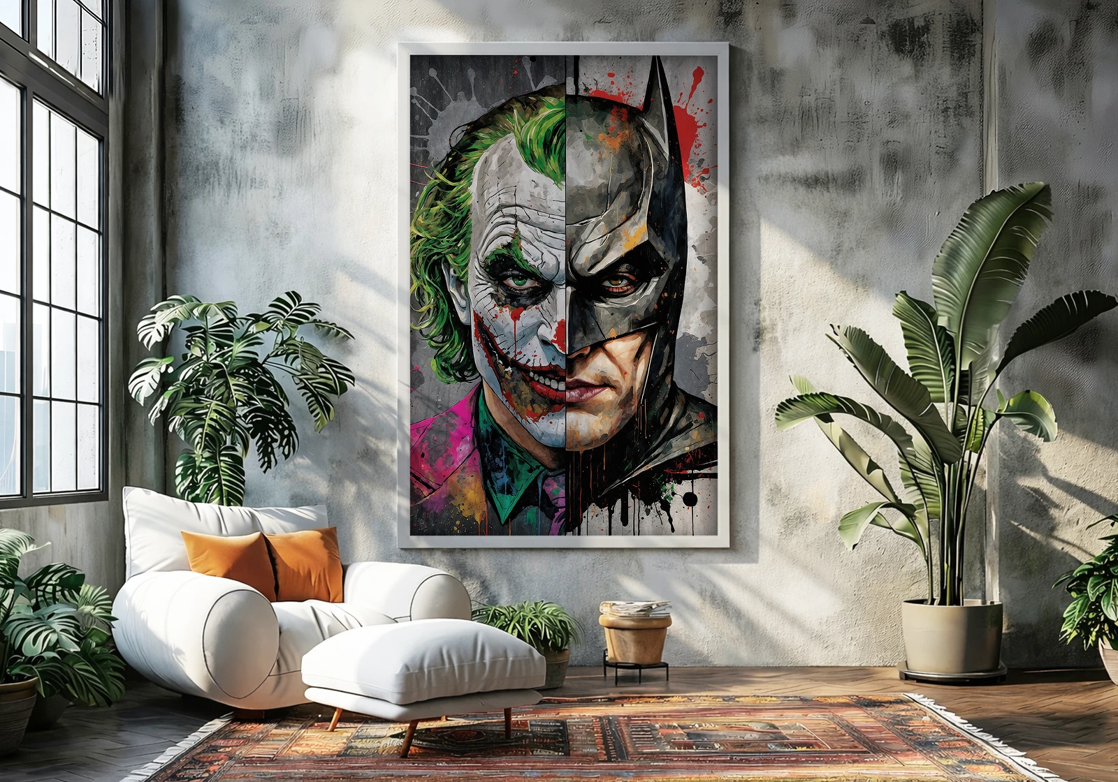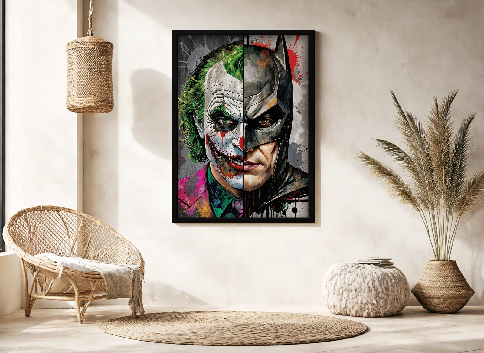 Изображение объединяет два персонажа — Джокера и Бэтмена — в одном выразительном портрете, разделённом по центру. Контрастные цвета, яркие мазки и детальная проработка создают сильный визуальный эффект.