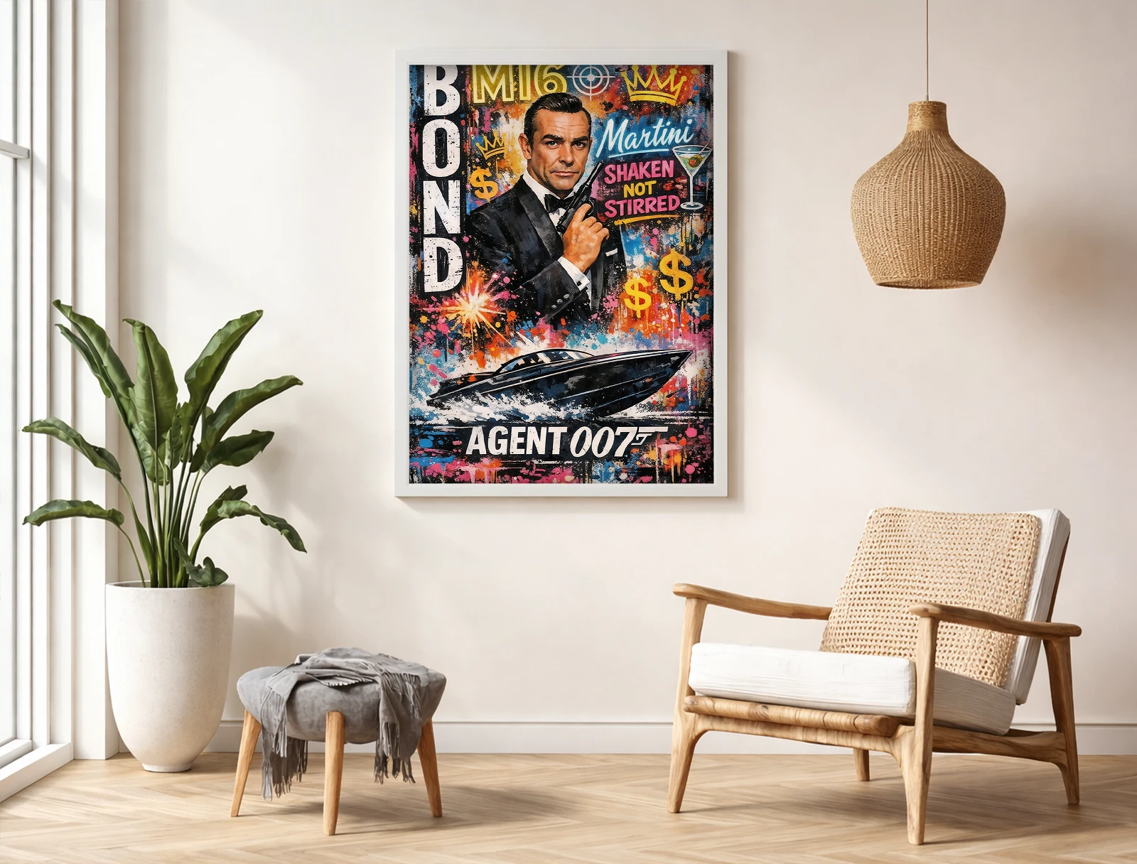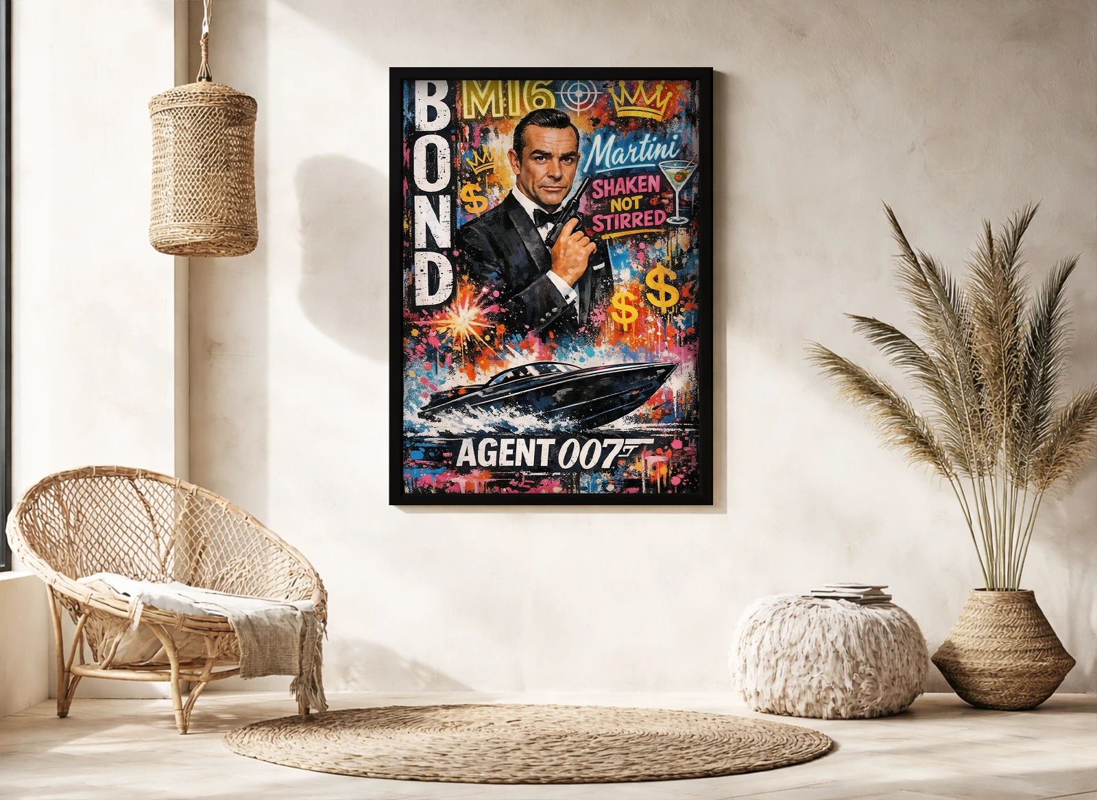 Картина изображает агента MI6 в классическом костюме на фоне ярких графических элементов, денег и символов роскоши. Внизу композиции катер добавляет движение и энергию.