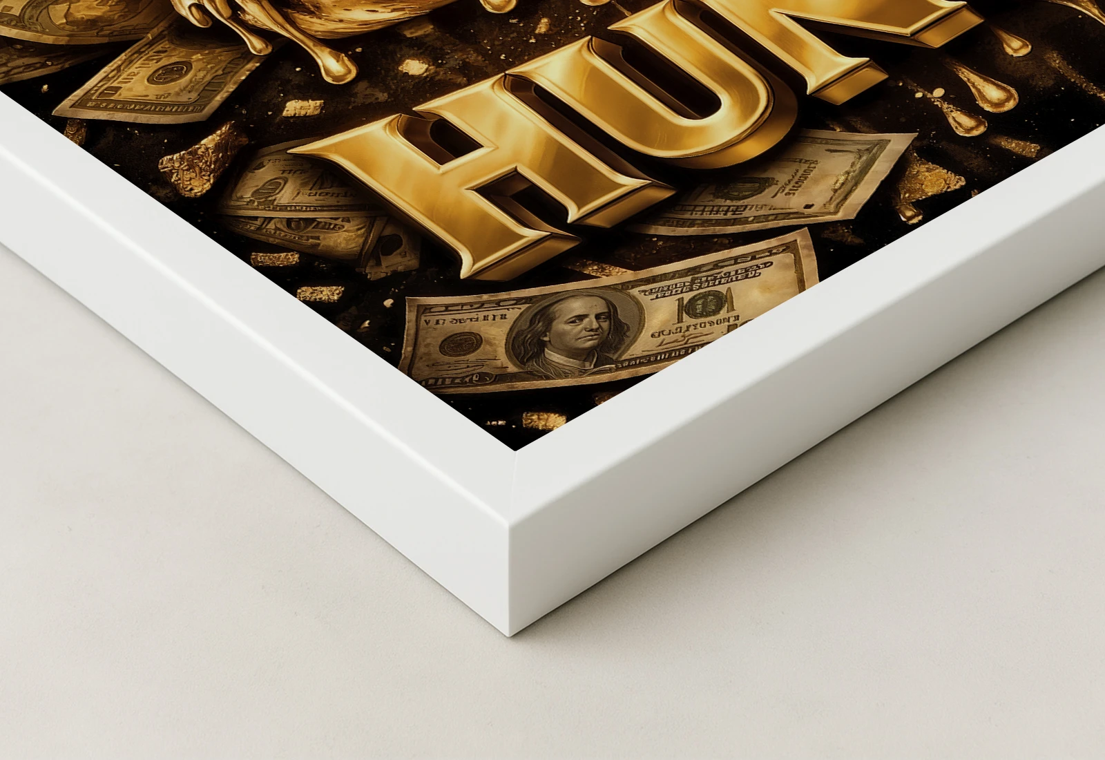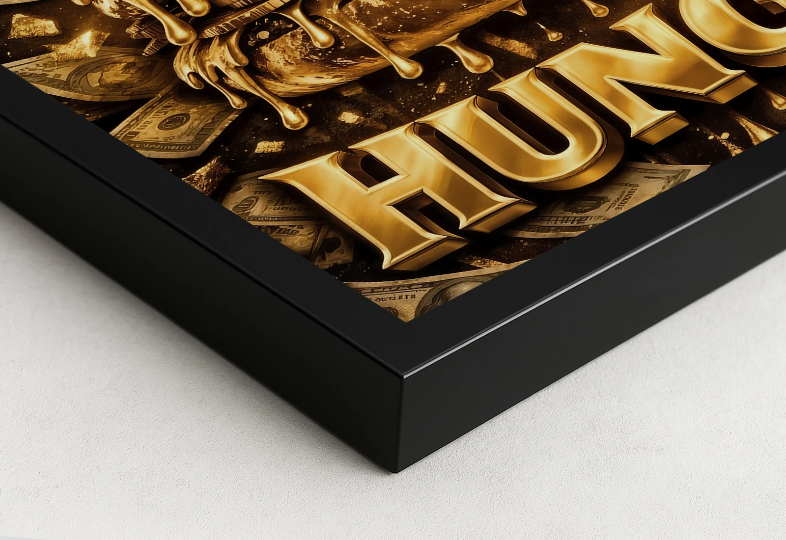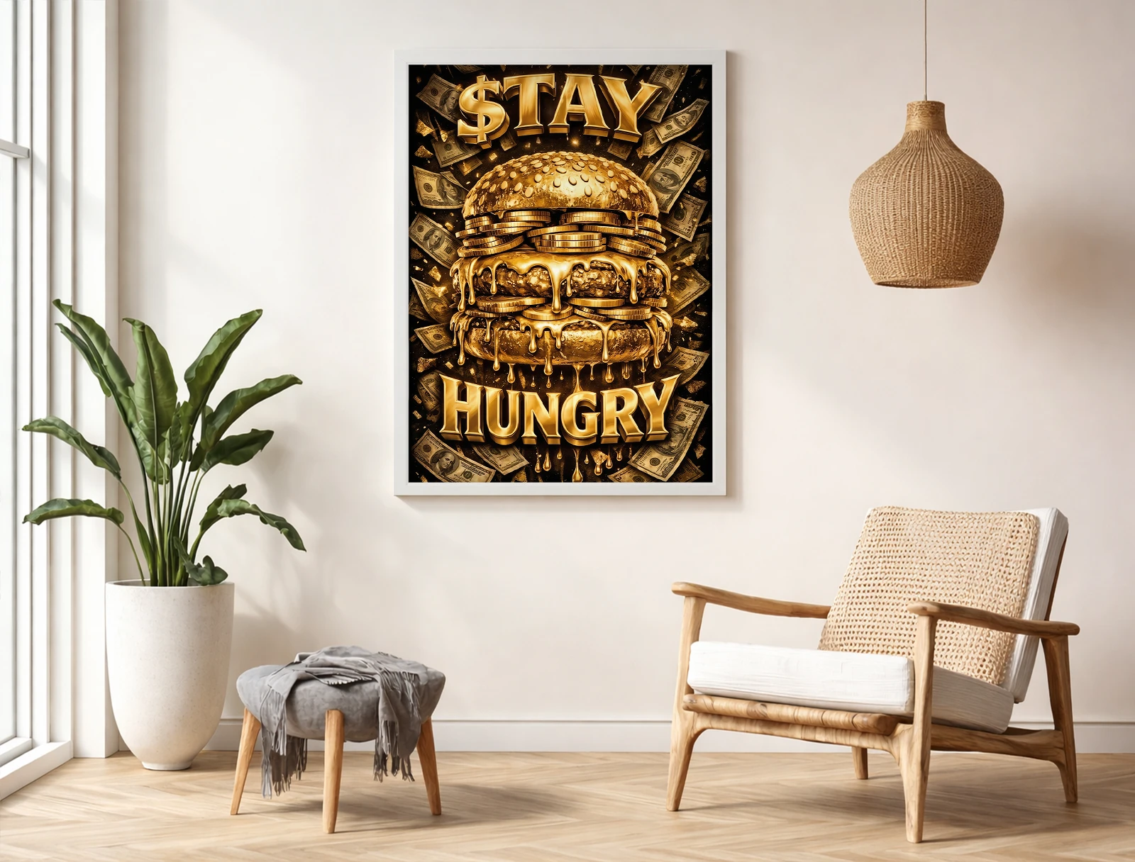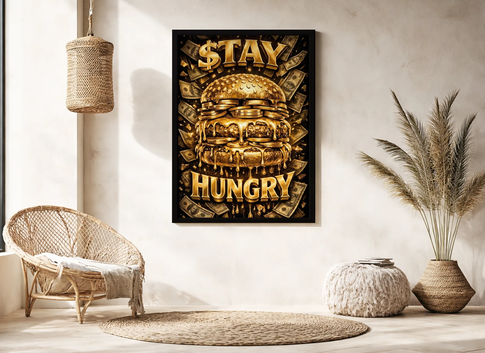 Картина изображает бургер в золотом исполнении с монетами и купюрами, создавая эффект роскоши и изобилия.