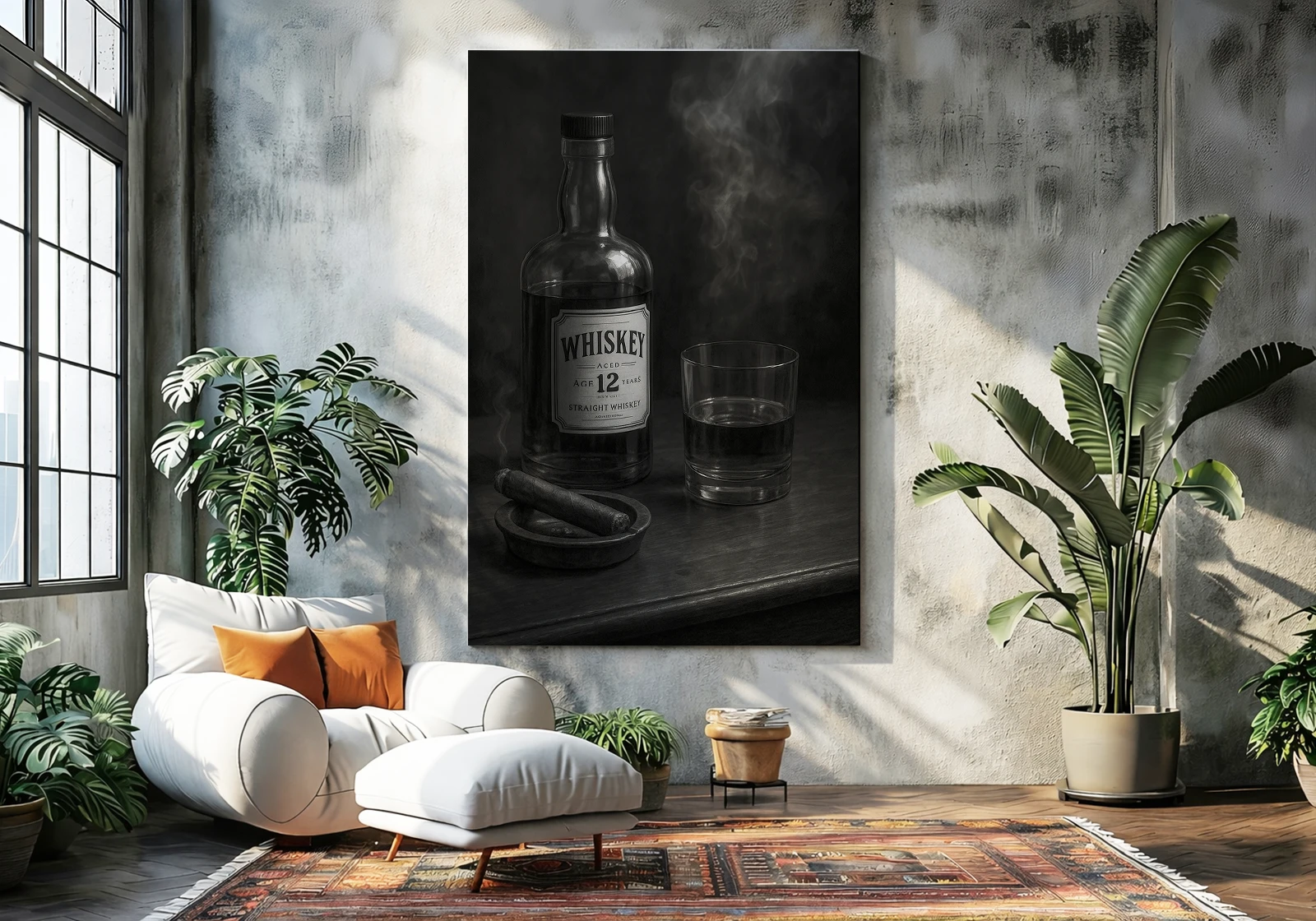 Я смотрю на этот холст и чувствую атмосферу спокойного вечера, наполненного ароматом дорогого табака и выдержанного напитка. Это высококачественная латексная печать на натуральном холсте, представляющая собой эстетичный натюрморт: бутылку виски 12-летней выдержки, наполненный бокал и дымящуюся сигару в пепельнице.