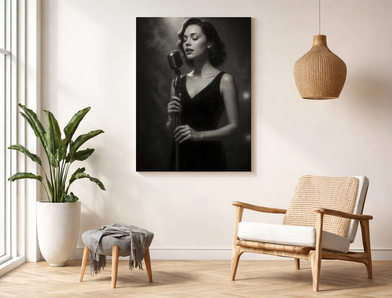 Я смотрю на этот холст и чувствую бархатный голос, растворяющийся в мягком свете софитов и дымке джаз-клуба. Это высококачественная латексная печать на натуральном холсте, представляющая эстетичный портрет джазовой певицы в элегантном вечернем платье, полностью погруженной в исполнение у классического ретро-микрофона.