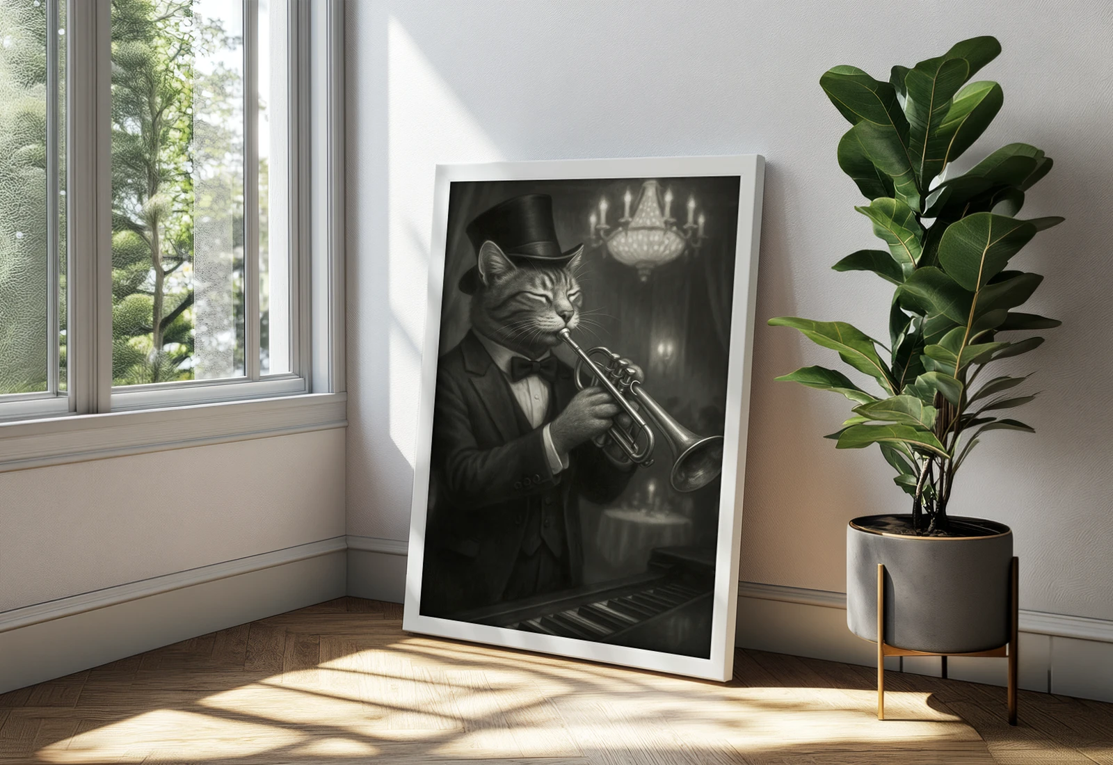 Эта картина вызывает улыбку и сразу создаёт настроение. Кот в элегантном костюме играет на трубе, словно настоящий джазовый музыкант.