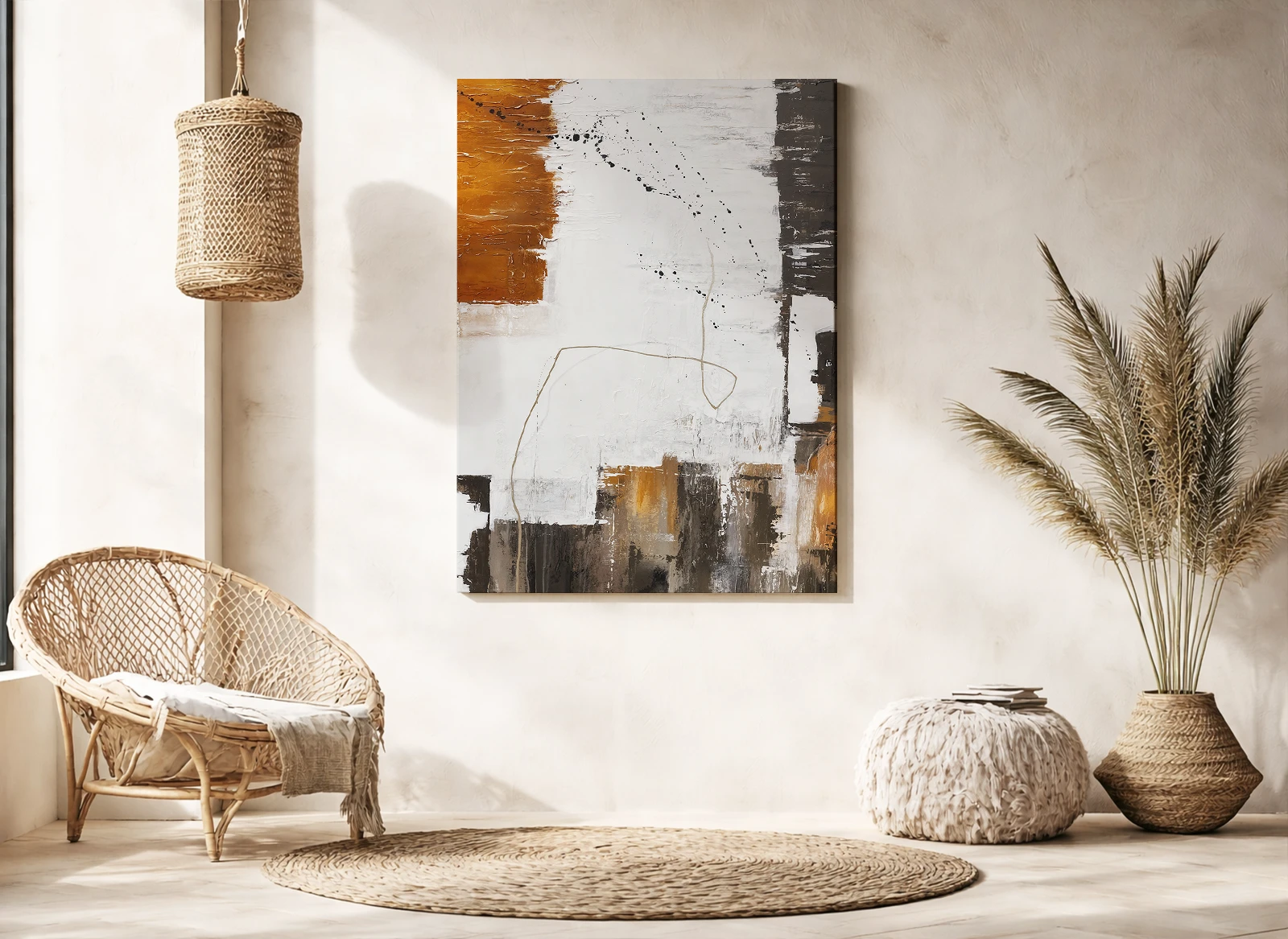 Сочетание насыщенного оранжевого цвета, глубоких антрацитовых пятен и тонких графичных линий на светлом фоне создает эффект многослойности и визуальной интриги. Плотная фактура материала и профессиональная галерейная натяжка преображают это изображение в мощный арт-объект, который станет идеальным дополнением интерьера в стиле лофт, модерн или минимализм.