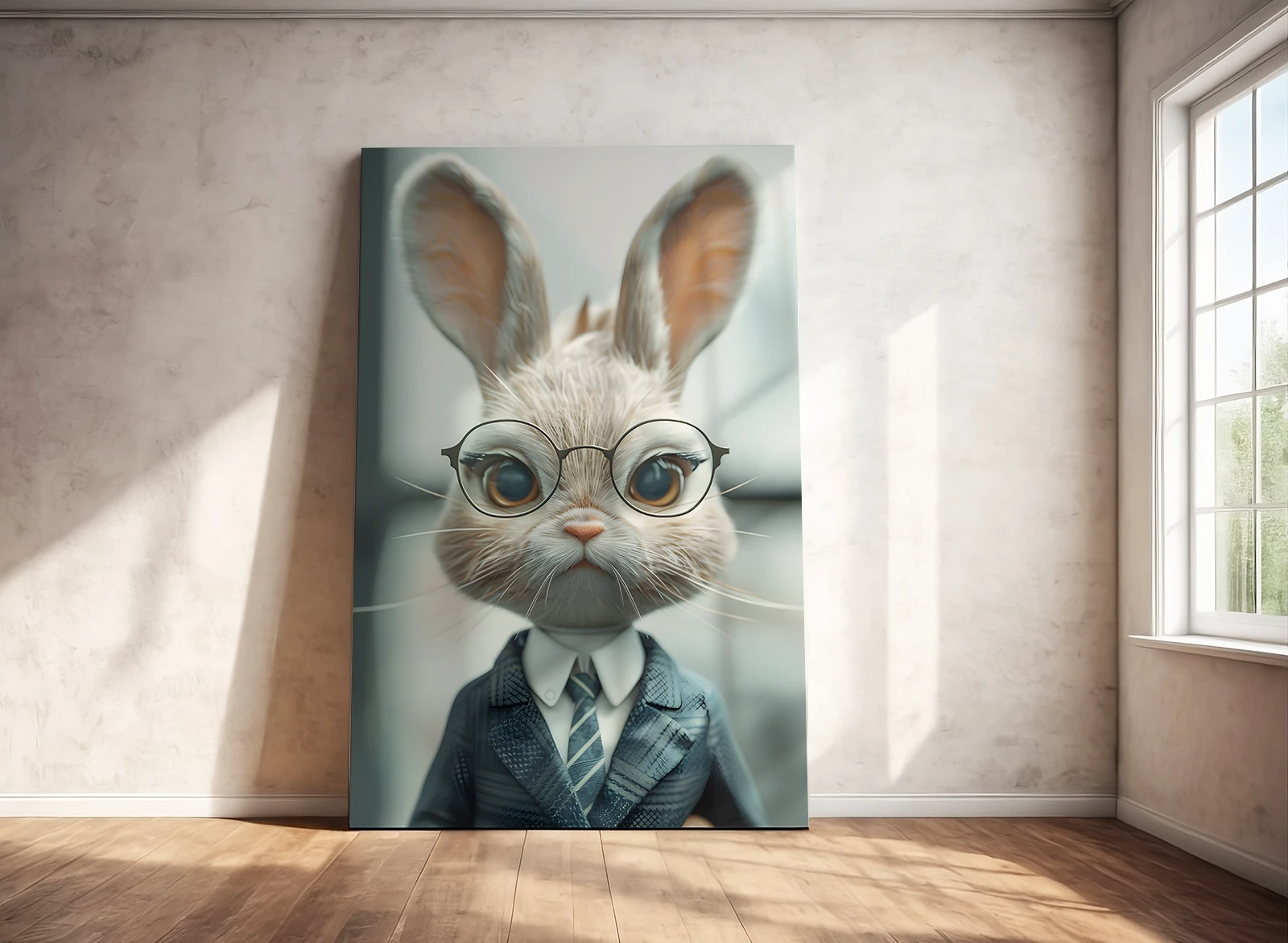 Я смотрю на этот холст и чувствую идеальный баланс строгого делового стиля и доброй иронии. Это высококачественная латексная печать на натуральном холсте, представляющая собой антропоморфный портрет серьезного кролика в очках, белой рубашке с галстуком и классическом пиджаке.