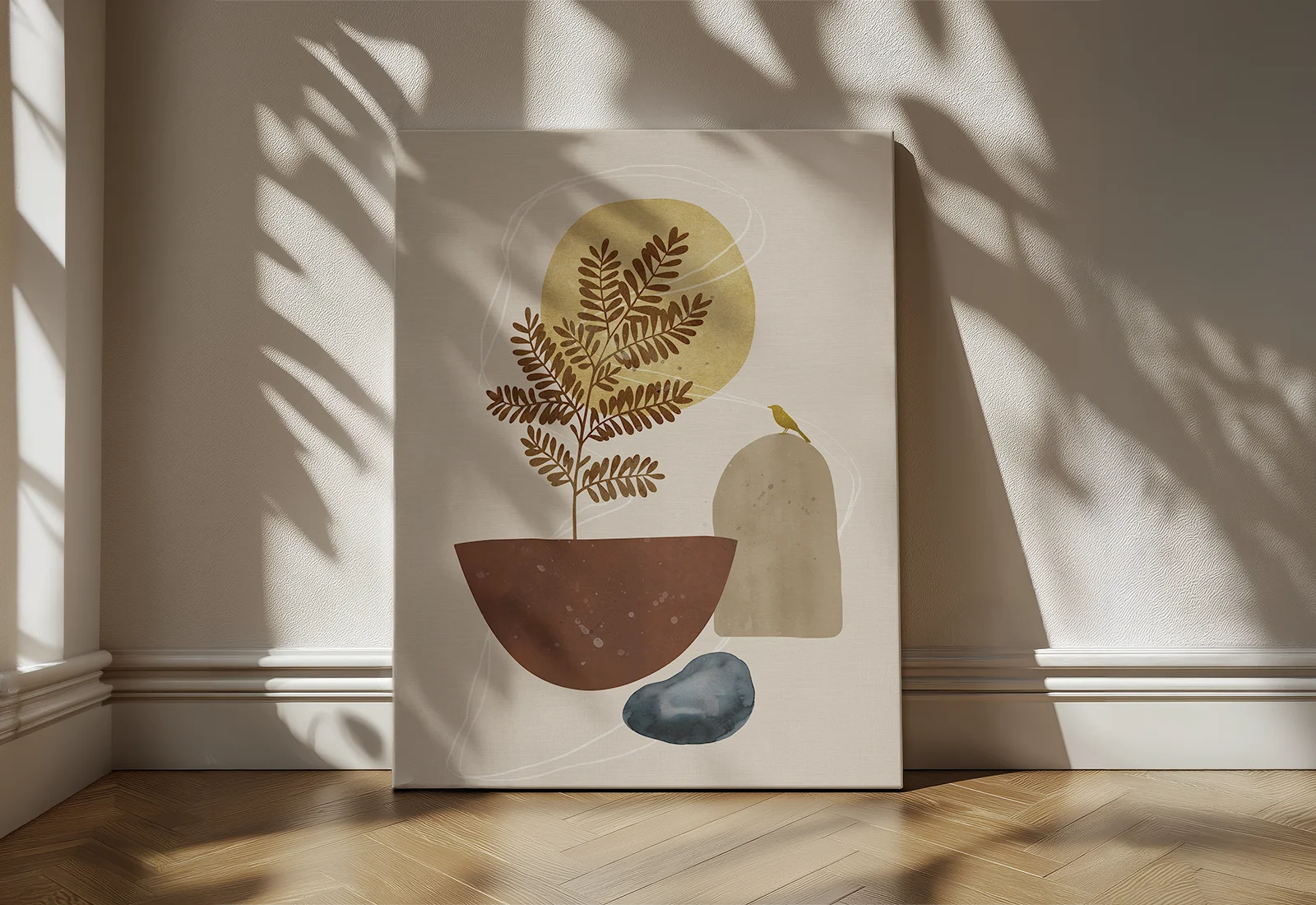 Мягкое золотистое солнце на заднем плане создает теплую, обволакивающую атмосферу, а маленькая фигурка птицы добавляет картине жизни и поэтичности. Цветовая гамма выдержана в приятных пастельных и землистых тонах: терракотовом, песочном и приглушенном синем, что позволяет работе гармонично вписаться в любой современный интерьер.
