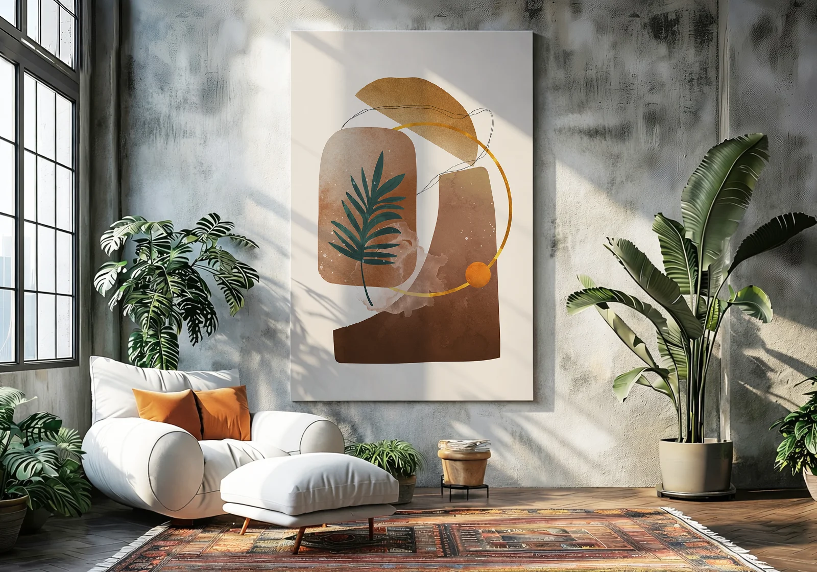 Художественная композиция на холсте представляет собой гармоничное сочетание органических форм и природных элементов. В центре сюжета изображена стилизованная тропическая ветвь с зелеными листьями, которая эффектно контрастирует с крупными абстрактными фигурами в теплых коричневых и охристых тонах.