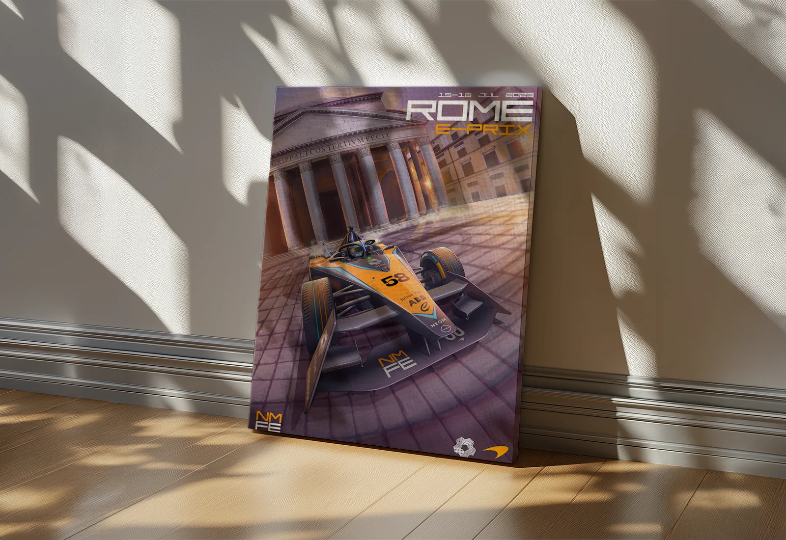 На данном художественном полотне представлена впечатляющая динамичная композиция, посвященная гонке Формула E Rome E-Prix. Центральным объектом является футуристичный гоночный болид команды NEOM McLaren под номером 58, запечатленный на фоне величественного римского Пантеона.