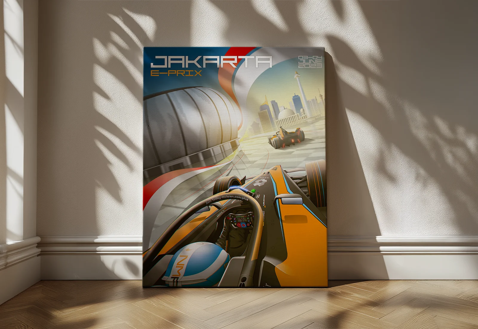 Изображение мастерски сочетает в себе спортивный азарт и архитектурную эстетику столицы Индонезии под ярким солнечным небом. Цветовая палитра картины насыщена фирменным оранжевым цветом McLaren, который контрастирует с мягкими голубыми и бежевыми оттенками фона, придавая работе энергичный и технологичный вид.