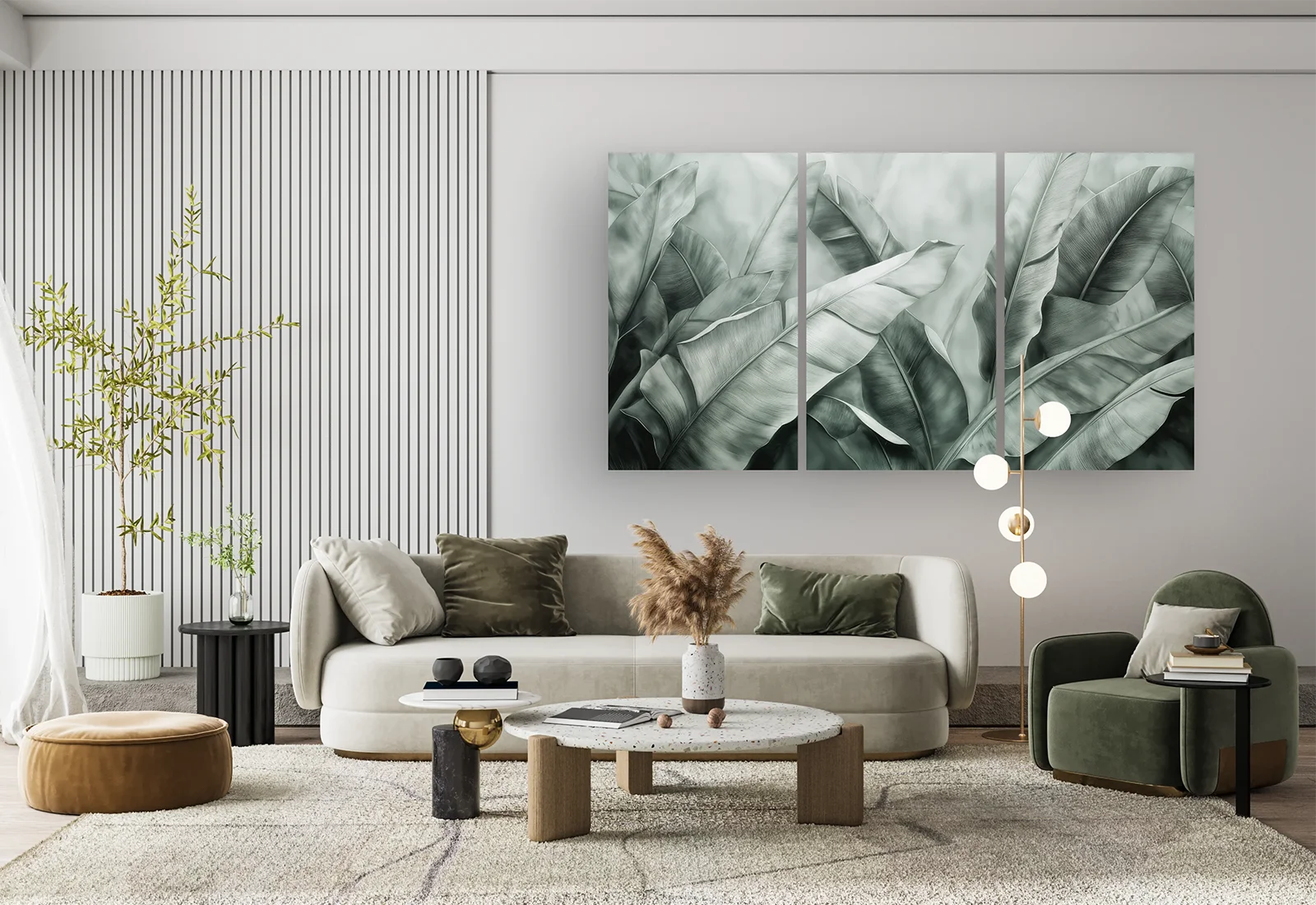 Я выбрал эту модульную картину с крупными тропическими листьями за её выразительность и глубину цвета. Насыщенные зелёные оттенки создают ощущение плотной природной текстуры, а крупный план листьев делает изображение более эффектным и современным.