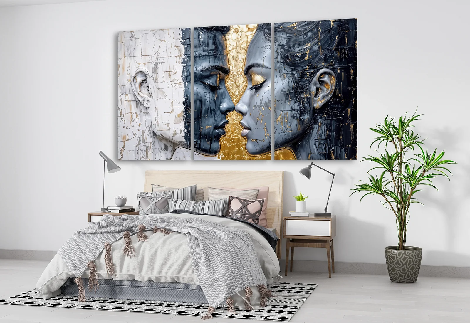 Я выбрал эту модульную картину с поцелуем за её сильную эмоциональную выразительность и контраст. Два лица, выполненные в холодных и тёплых оттенках, соединяются в центре, создавая напряжённый и притягательный визуальный акцент.