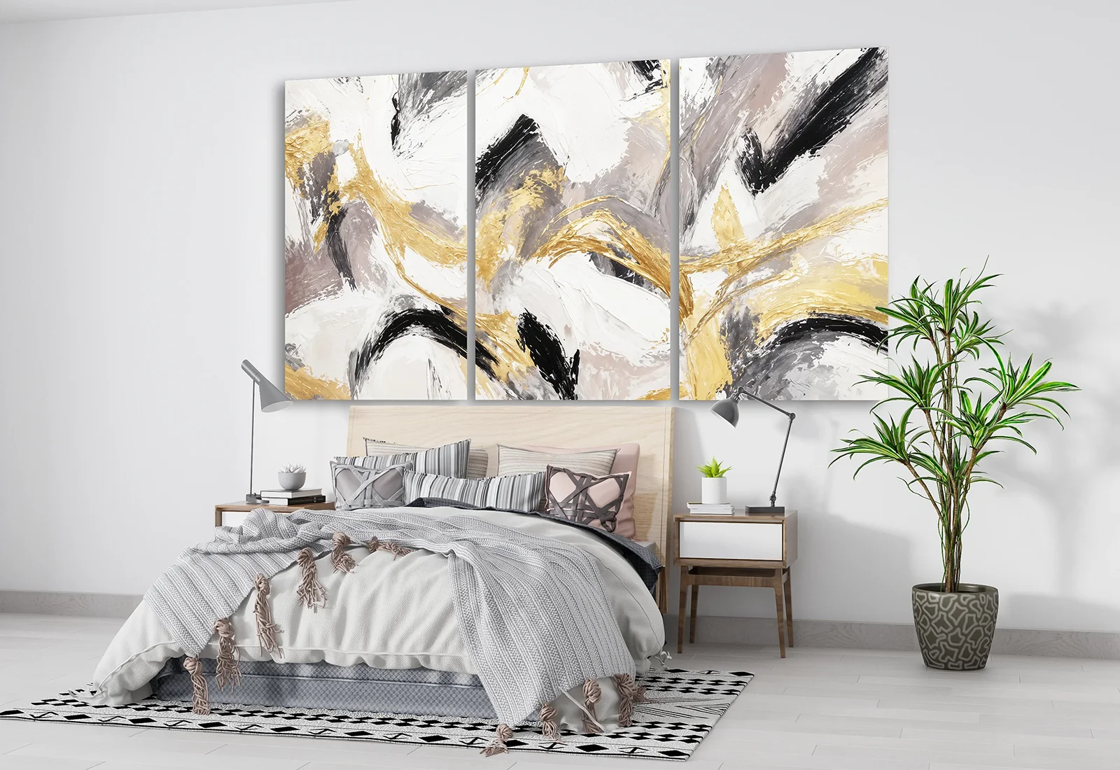Я выбрал эту модульную картину с абстрактными мазками за её динамику и выразительность. Золотые линии словно проходят через композицию, связывая светлые и тёмные участки в единое целое.