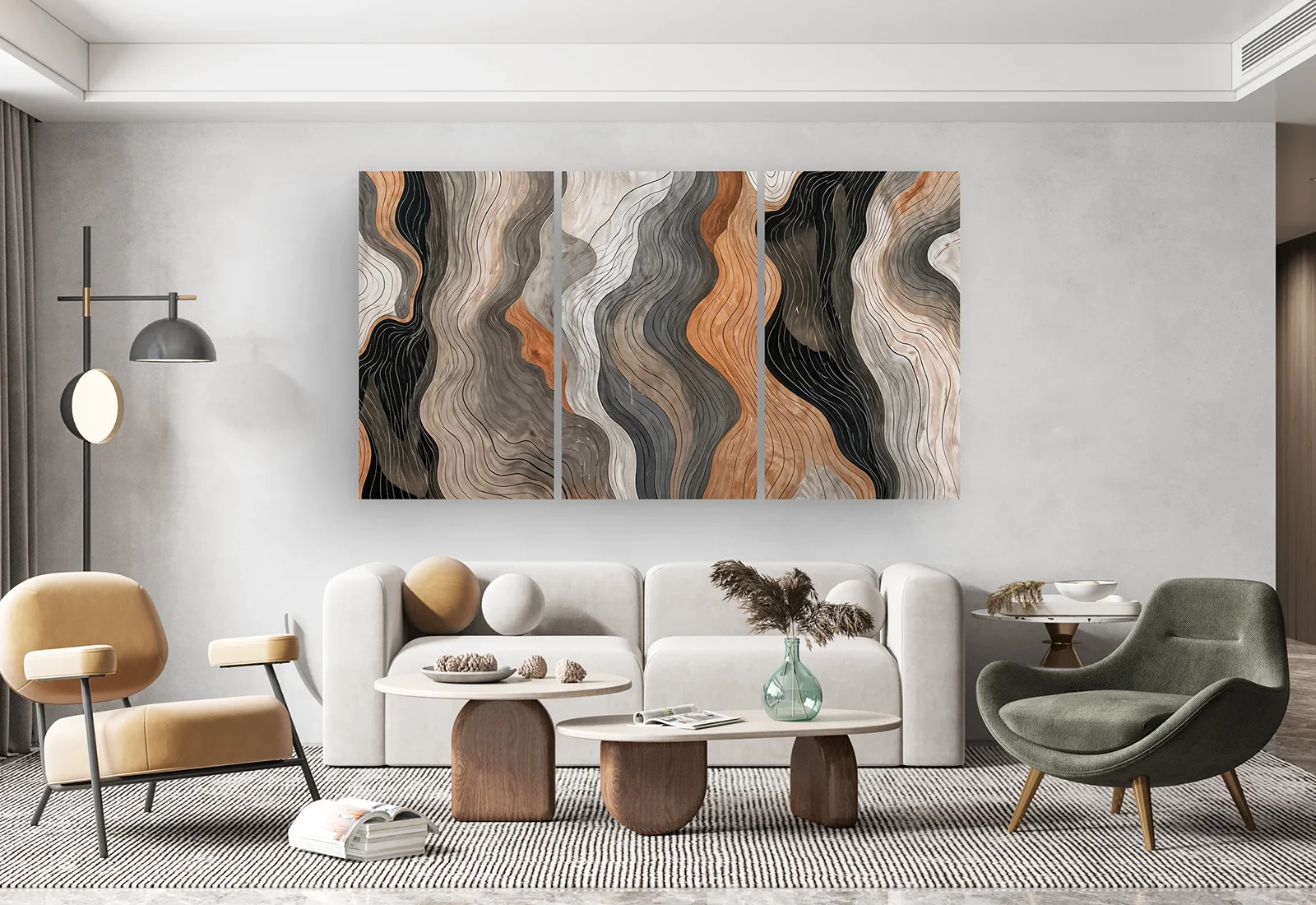 Я выбрал эту модульную картину с волнистыми линиями за её спокойную динамику и гармонию форм. Плавные изгибы создают ощущение движения, а сочетание бежевых, коричневых и тёмных оттенков делает композицию тёплой и сбалансированной.