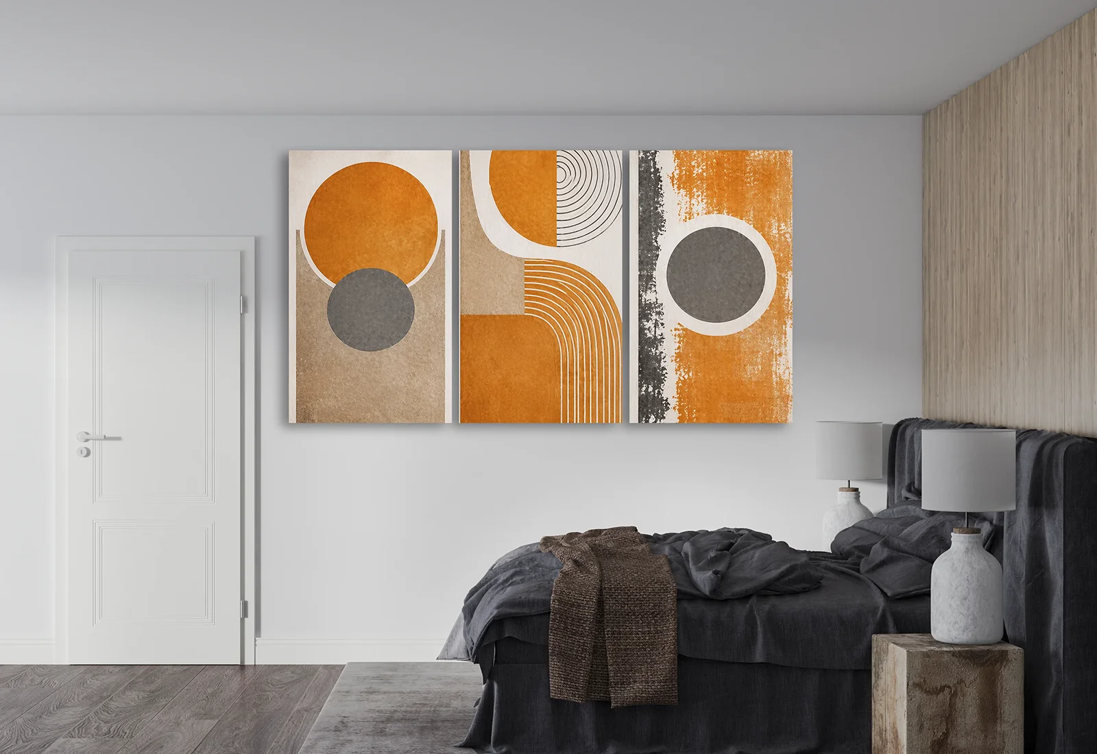 Я выбрал эту модульную картину с геометрией за её чёткую структуру и выразительный цвет. Оранжевые круги создают яркий акцент, который гармонично сочетается с нейтральными бежевыми и серыми оттенками.