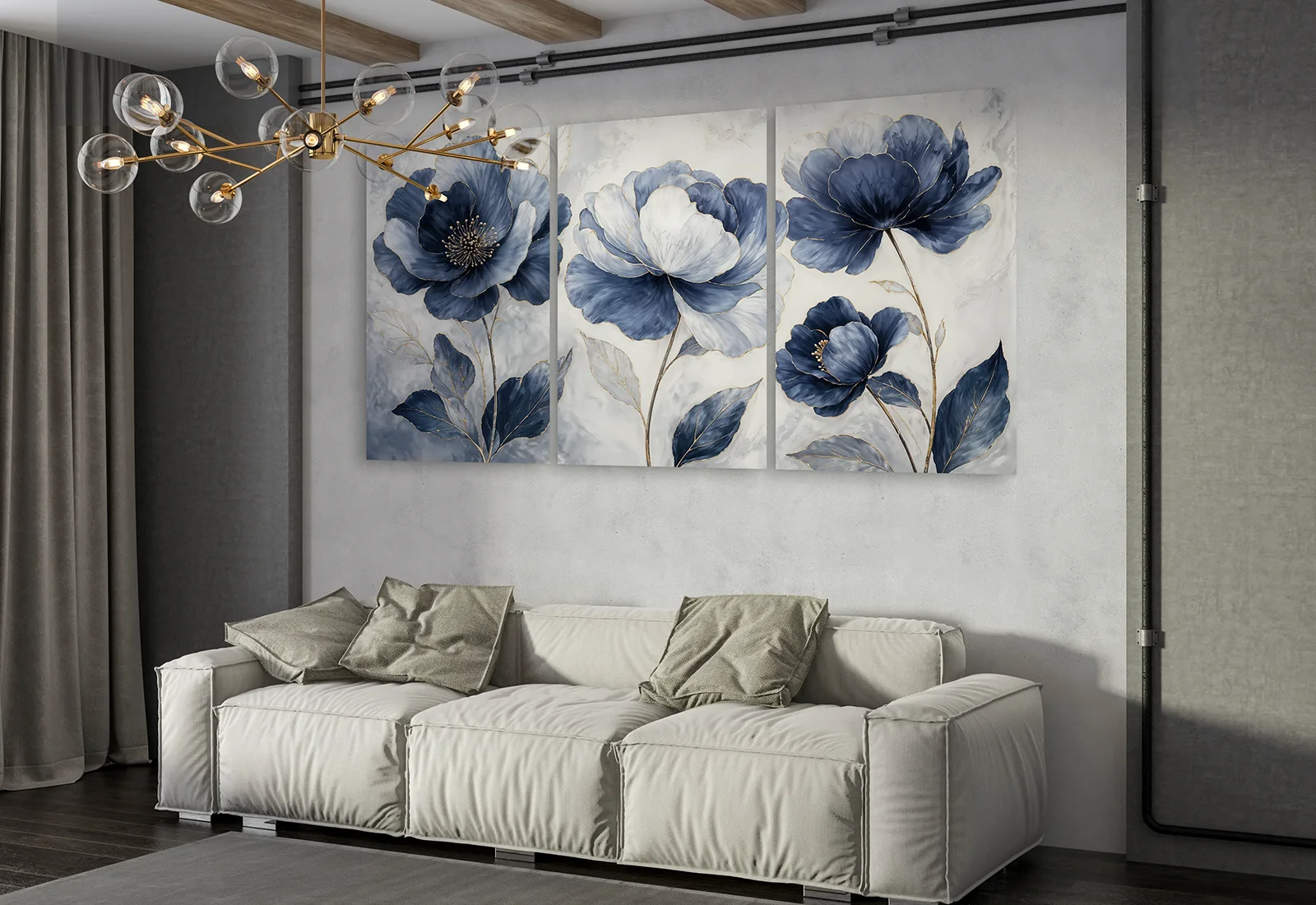 Эта модульная картина с синими цветами создаёт ощущение лёгкости и гармонии в интерьере. Крупные цветочные элементы выполнены в мягких оттенках синего и белого, что придаёт композиции изысканность и спокойствие.