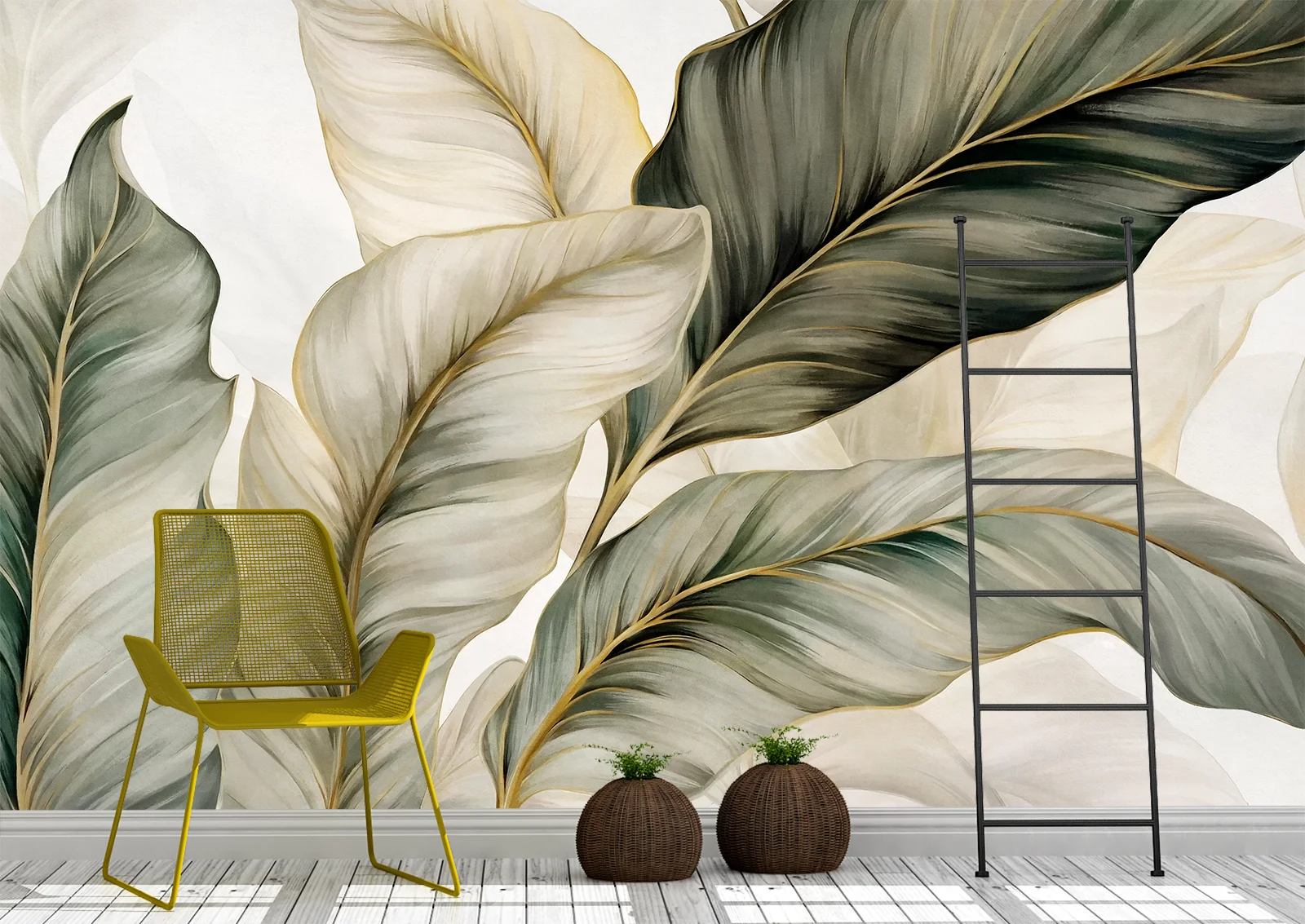 Фотообои с крупными тропическими листьями и золотыми прожилками создают эффектный и современный интерьер.