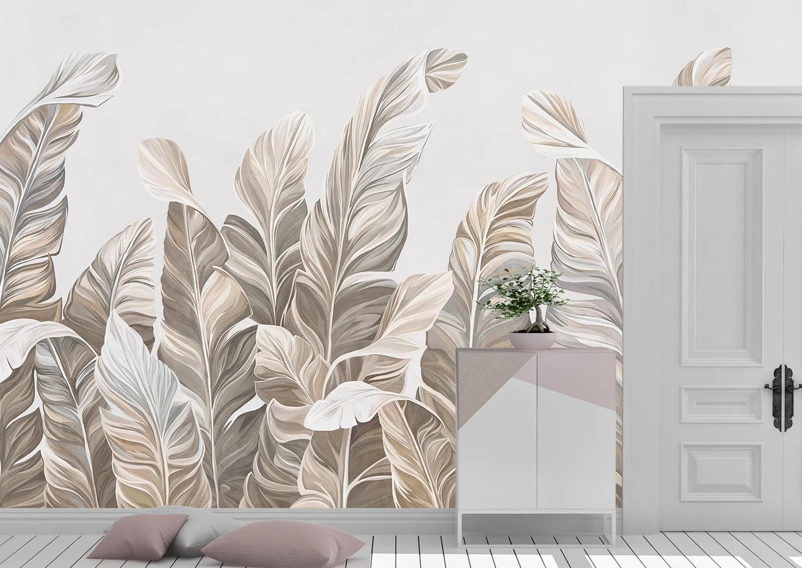 Фотообои с изящными бежевыми тропическими листьями создают лёгкий и гармоничный интерьер. Светлая палитра визуально расширяет пространство и добавляет ощущение чистоты и уюта.