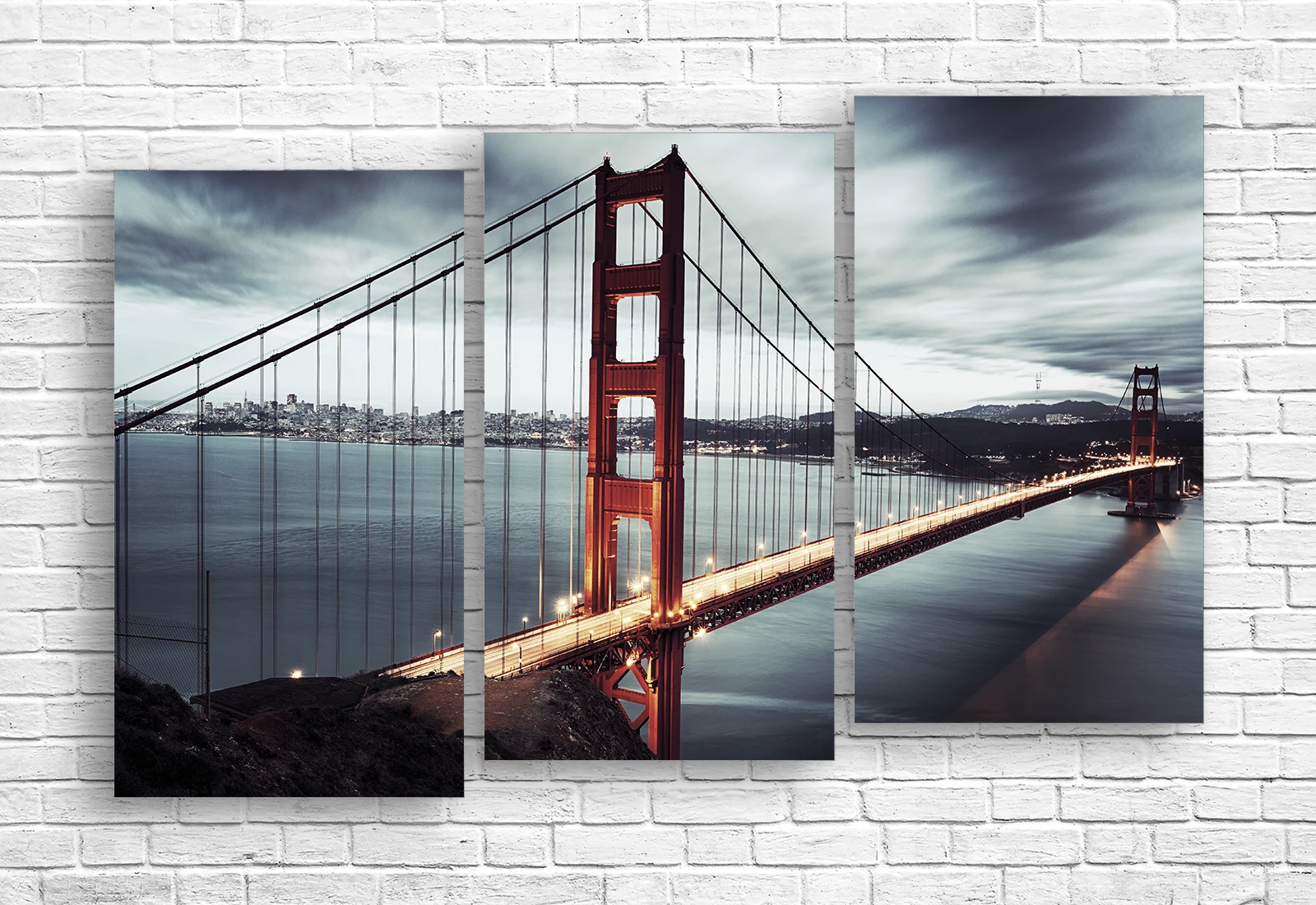 Эта величественная модульная картина запечатлела знаменитый мост Золотые Ворота в Сан-Франциско в час сумерек. Композиция из трех частей (триптих) передает мощь инженерной мысли и красоту природы. Красные опоры моста эффектно выделяются на фоне драматичного пасмурного неба и холодных вод залива.