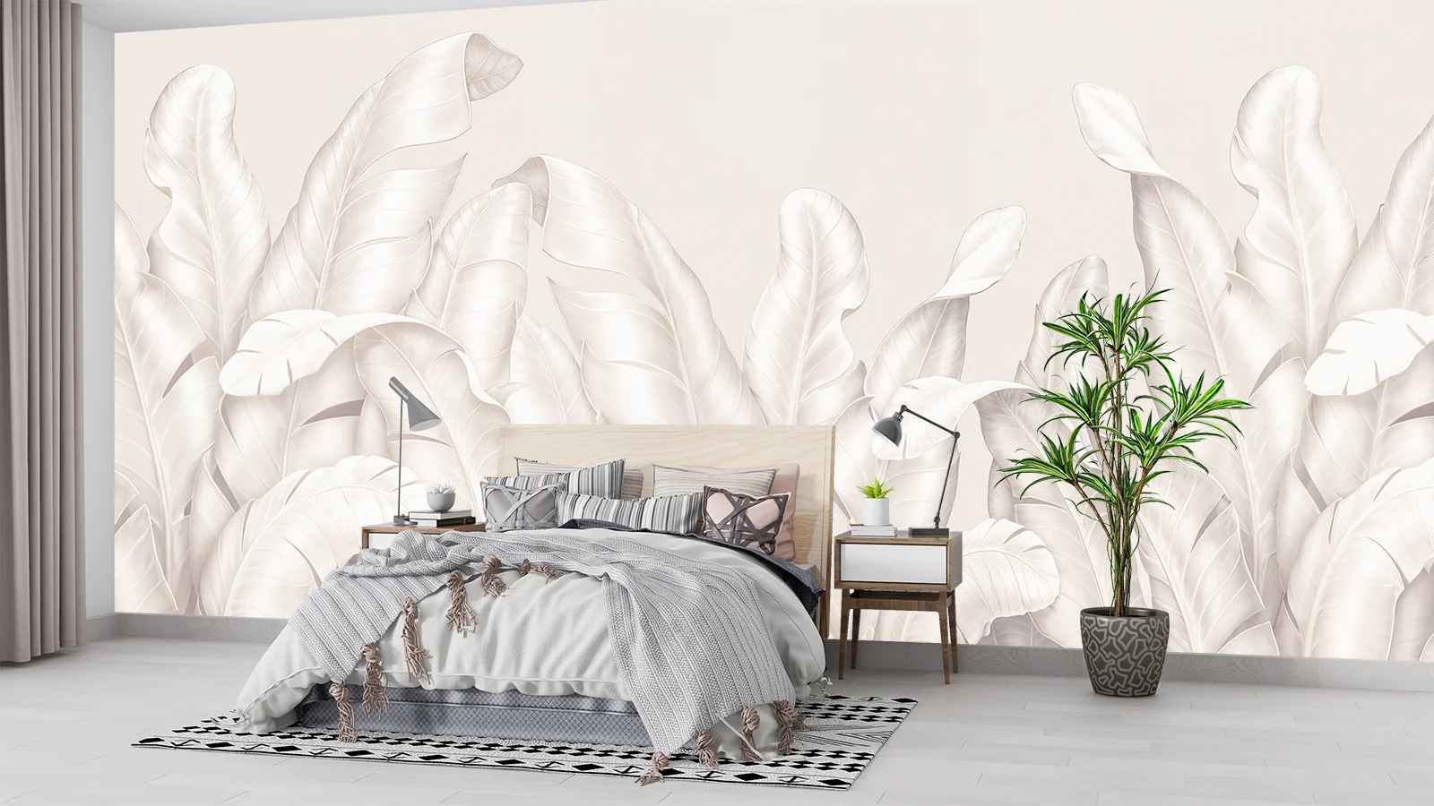 Фотообои с крупными тропическими листьями в светлой бежевой палитре идеально подходят для оформления спальни.
