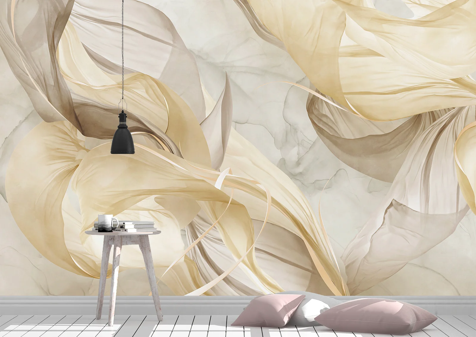 Фотообои с плавными абстрактными волнами в бежево-золотой палитре создают ощущение движения и глубины.