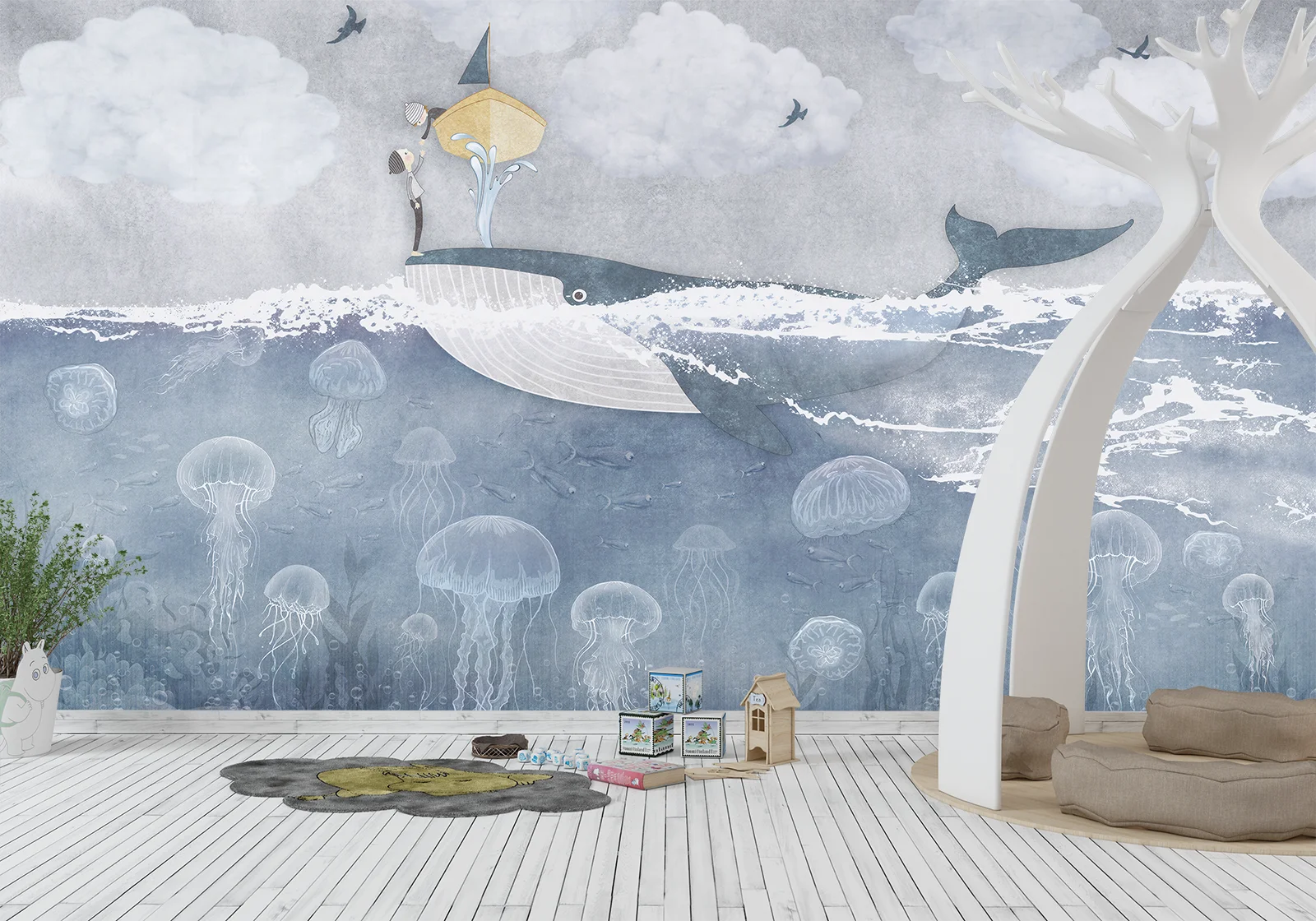 Фотообои с китом, лодкой и медузами создают волшебный подводный мир. Мягкие голубые оттенки и сказочный сюжет идеально подходят для оформления детской комнаты.