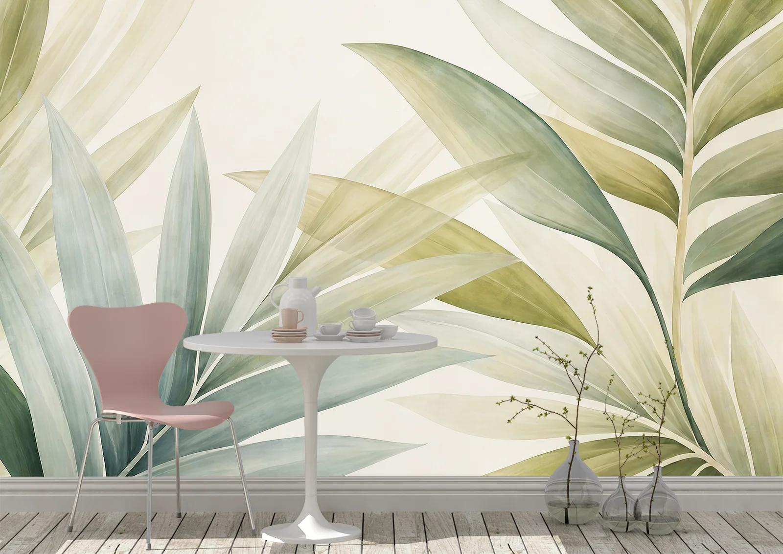 Фотообои с акварельными листьями в мягких зелёных и бежевых оттенках придают интерьеру лёгкость и свежесть. Идеальны для современных и природных стилей оформления.