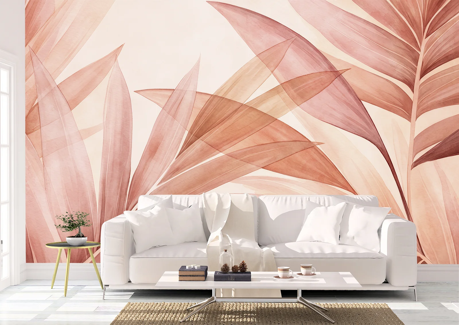 Фотообои с акварельными листьями в коралловых и бежевых оттенках придают интерьеру тепло и лёгкость. Отличный выбор для создания уютной атмосферы в доме.