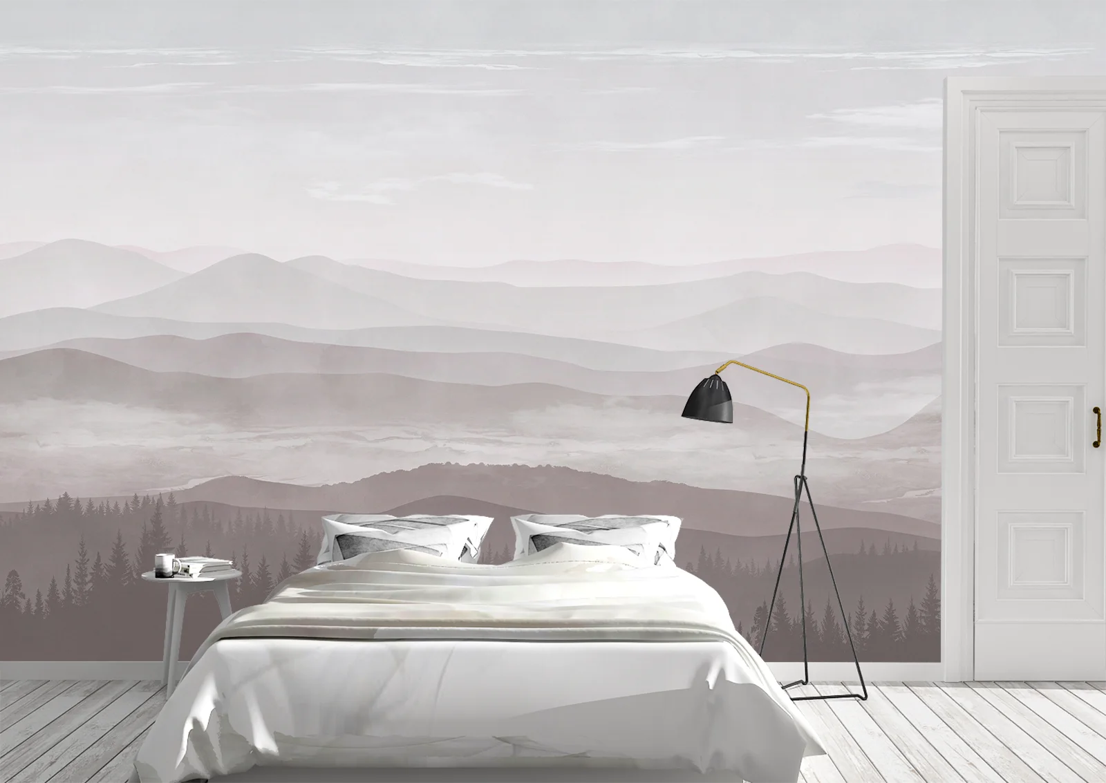 Фотообои с многослойными силуэтами гор в мягких пастельных оттенках создают атмосферу уюта и спокойствия. Идеальны для спальни и минималистичных интерьеров.