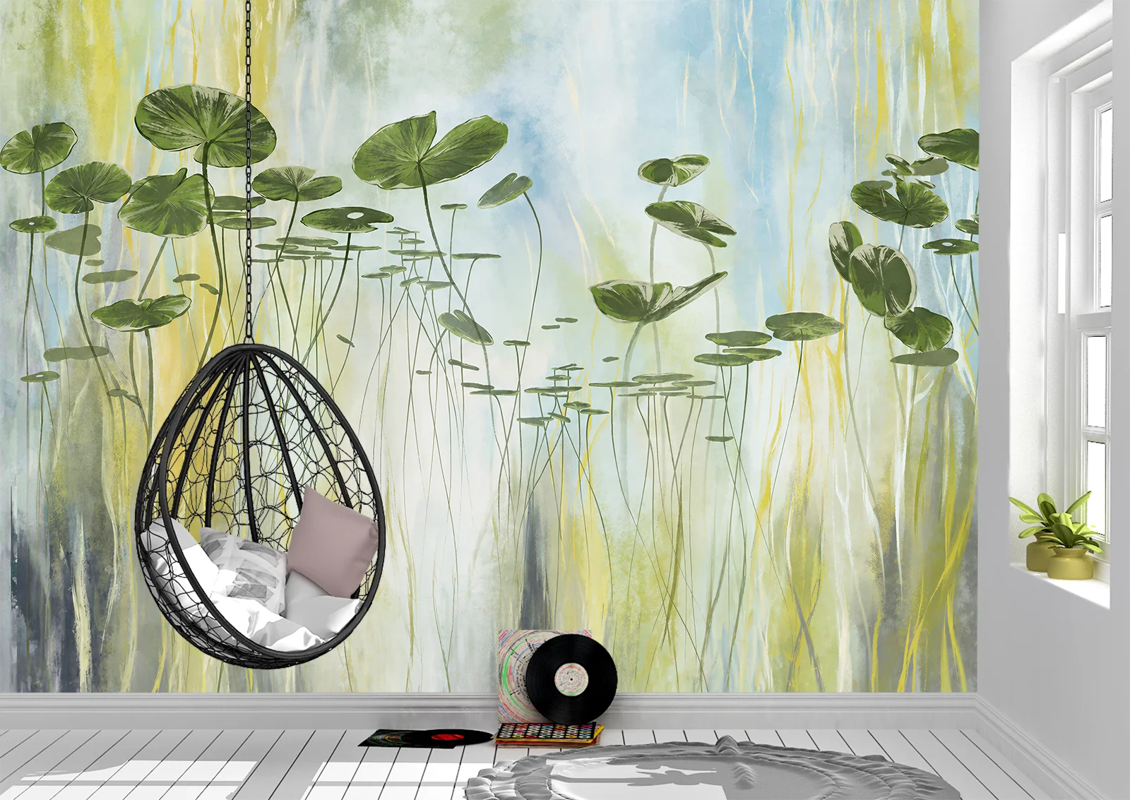 Фотообои с изящными акварельными листьями лотоса создают лёгкую и природную атмосферу.