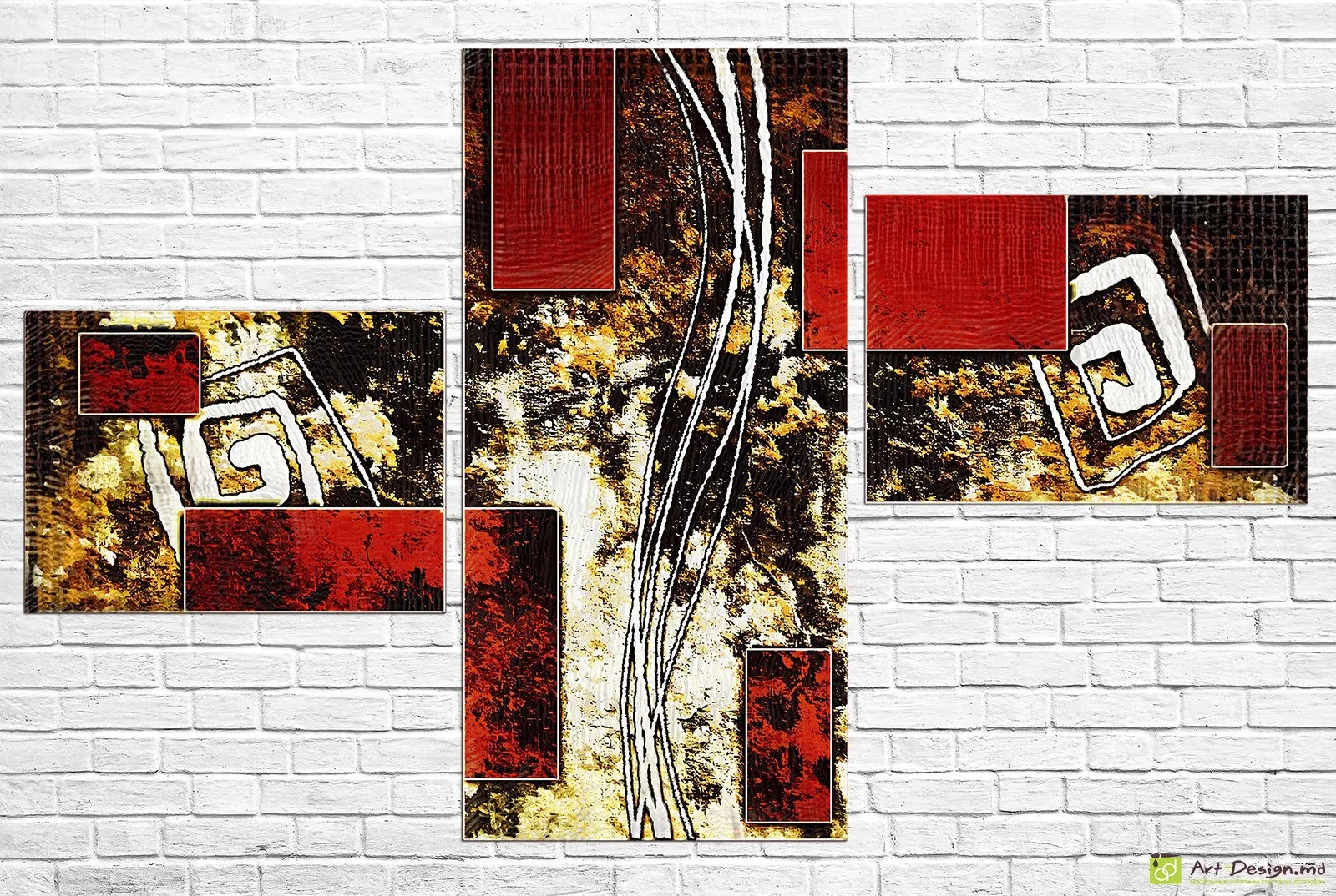 Tablou modular în stil abstract, realizat în nuanțe aurii și tonuri calde, care transmit dinamism și profunzime vizuală. Accentele roșii și liniile fluide creează o compoziție modernă și expresivă, ideală pentru a evidenția personalitatea spațiului.