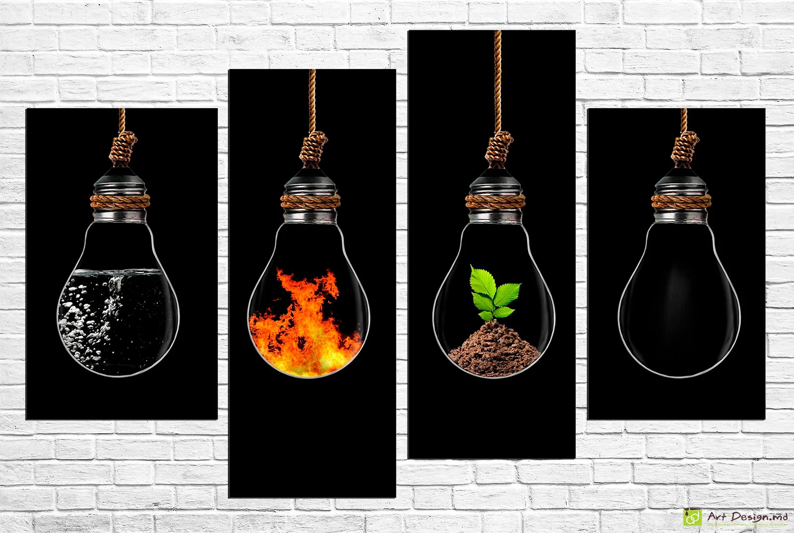 Tablou modular cu un concept artistic puternic, în care fiecare bec reprezintă o stare sau un element — apă, foc, pământ și gol, sugerând echilibrul dintre energie și creație. Contrastul dintre elementele luminoase și fundalul negru intens oferă profunzime vizuală și impact emoțional.
