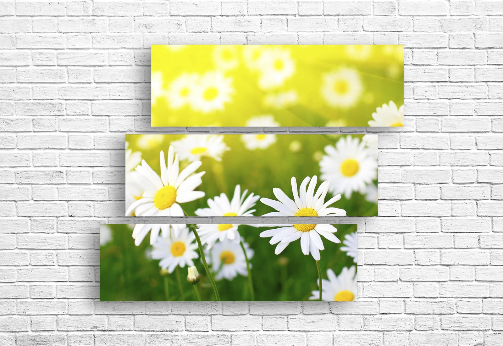 Acest tablou modular plin de viață, format din trei piese orizontale, vă transpune pe o pajiște nesfârșită de flori, scăldată în lumina blândă a soarelui. Subiectul central prezintă margarete delicate cu petale albe imaculate, care par să se întindă spre razele calde printre firele de iarbă verde crud.