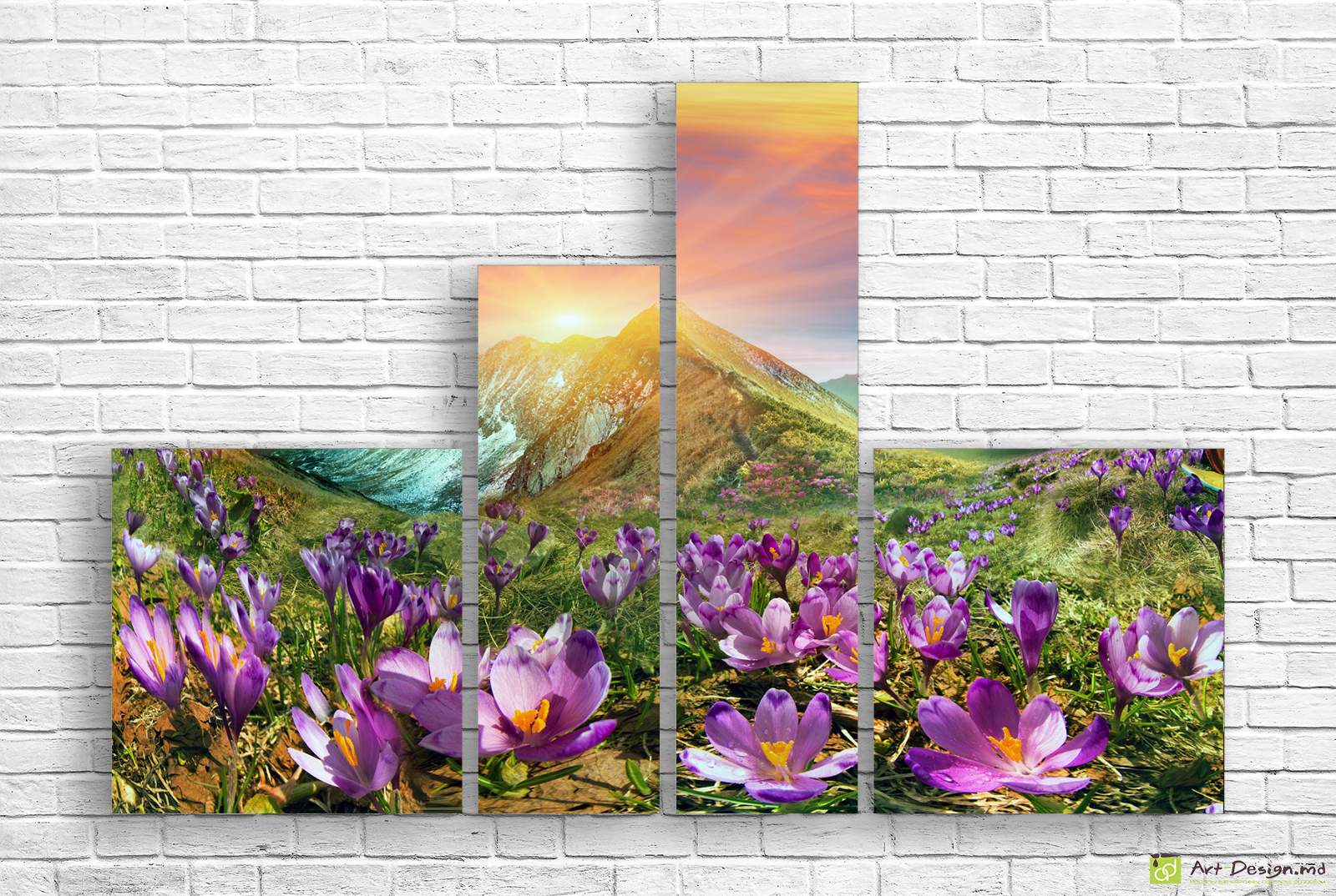 Tabloul modular „Munți și brândușe” aduce farmecul primăverii în interior. Contrastul dintre vârfurile luminate de soare și florile mov din prim-plan creează un efect vizual spectaculos. Structura poliptic transformă peretele într-un punct focal natural, luminos și plin de energie.