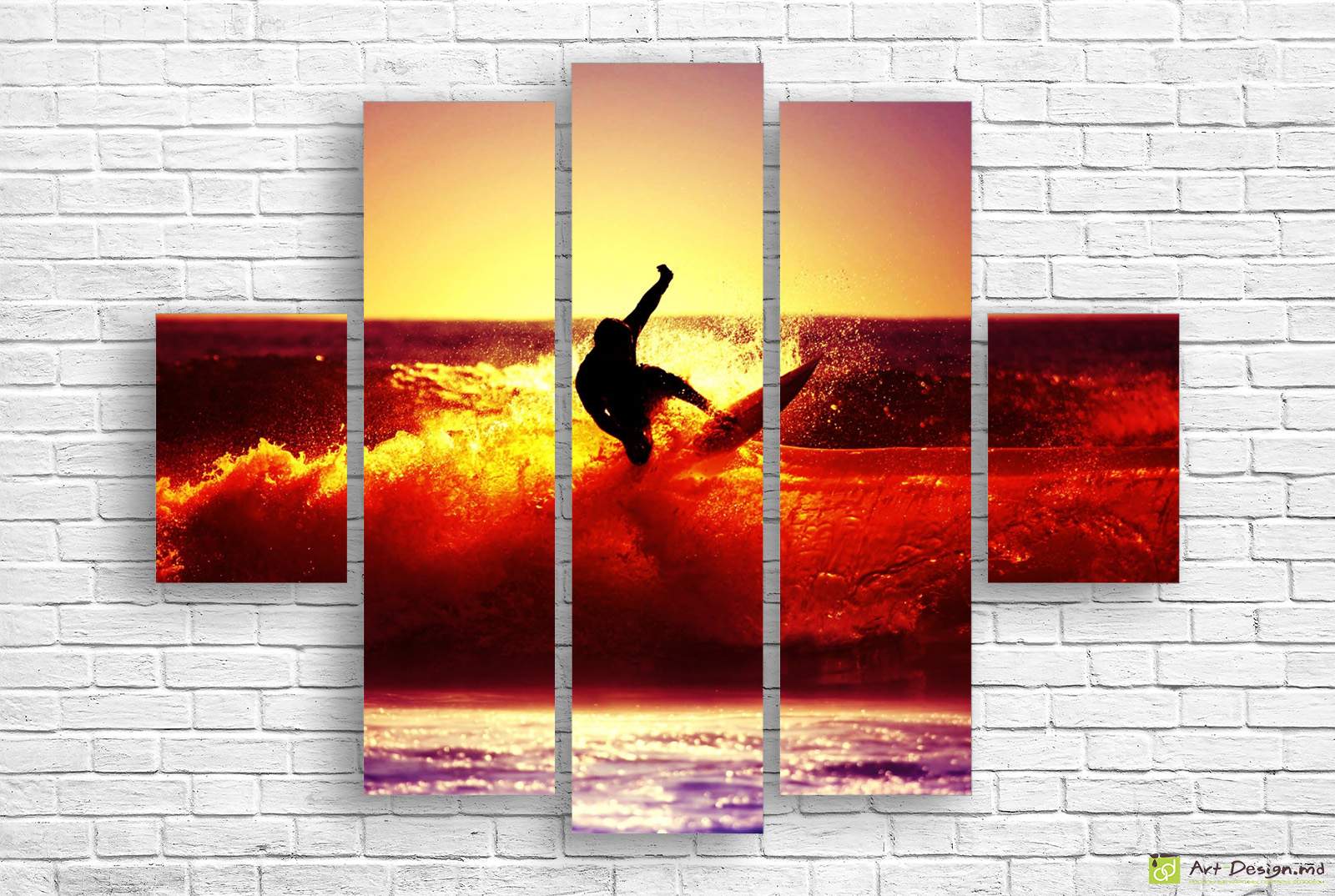 Acest tablou modular ce surprinde o imagine fascinantă de sport extrem, ilustrând un surfer curajos cucerind un val uriaș sub lumina caldă a soarelui la asfințit, este piesa ideală pentru a aduce o notă de energie și forță locuinței dumneavoastră. Compoziția formată din cinci piese verticale de înălțimi diferite oferă o perspectivă vizuală panoramică și modernă, transformând orice perete într-o fereastră deschisă spre libertatea absolută a oceanului.