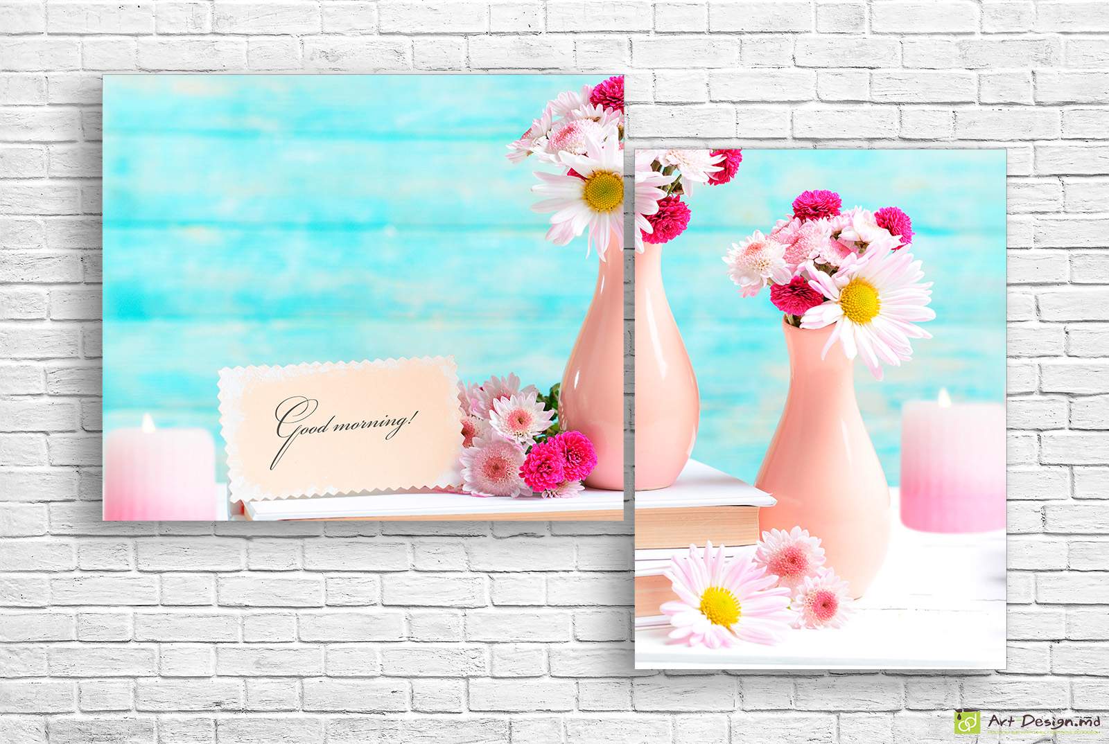Această lucrare modulară luminoasă și plină de pozitivism din două piese (diptic) emană atmosfera unei dimineți bucuroase și confortul casei. Pe pânză sunt înfățișate flori roz și albe delicate în vaze ceramice rafinate pe un fundal de lemn turcoaz, completate de o felicitare caldă. Paleta vibrantă cu accente fucsia și lumina blândă a lumânării creează o senzație de căldură și prospețime în orice încăpere.