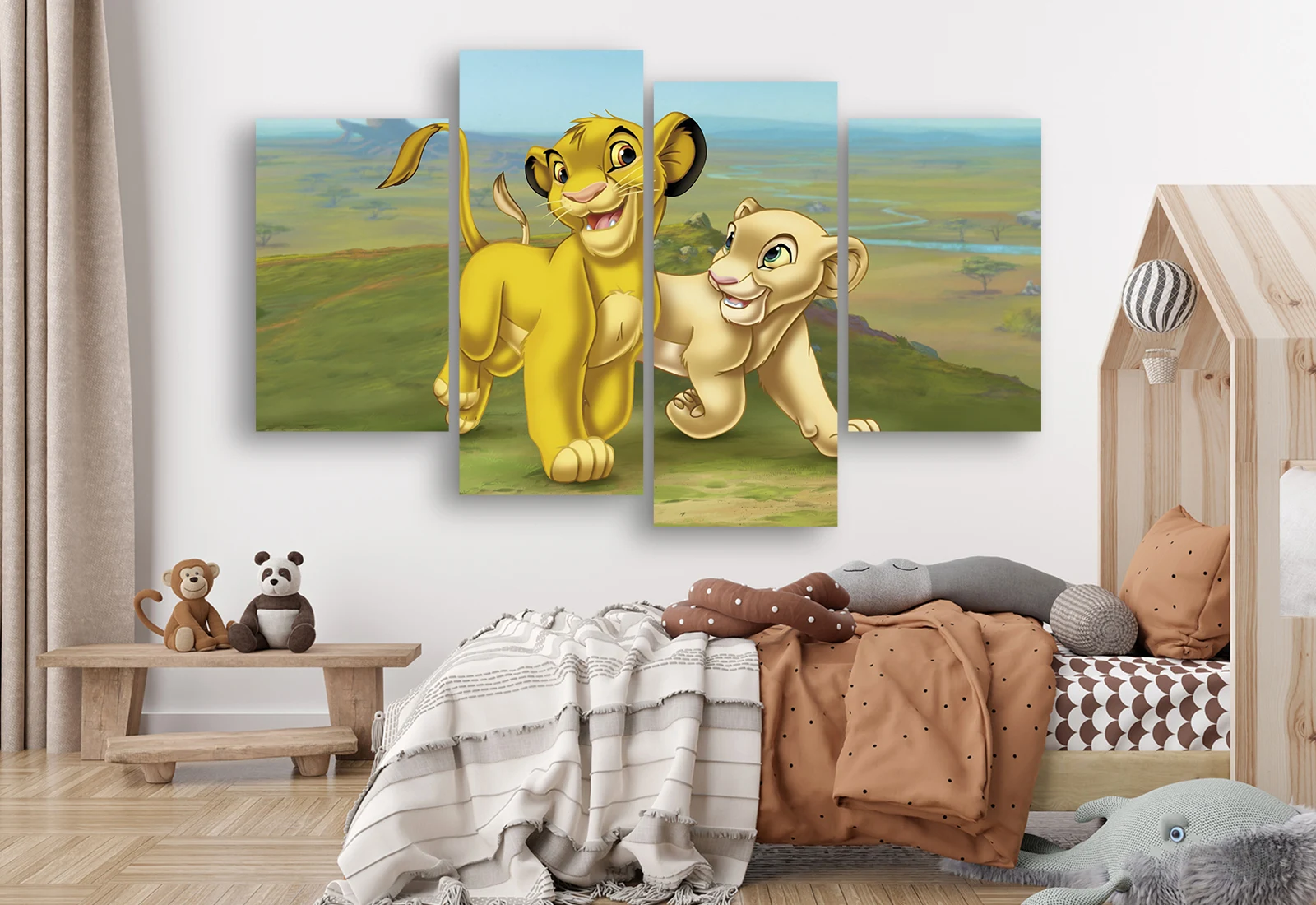 Tabloul modular „Regele Leu” aduce în camera copilului o atmosferă caldă, luminoasă și plină de bucurie. Simba și Nala, surprinși în timp ce aleargă prin savană, transmit energie pozitivă și emoții prietenoase. Culorile blânde și stilul ilustrativ creează un decor relaxant, plăcut și potrivit pentru copii de orice vârstă.