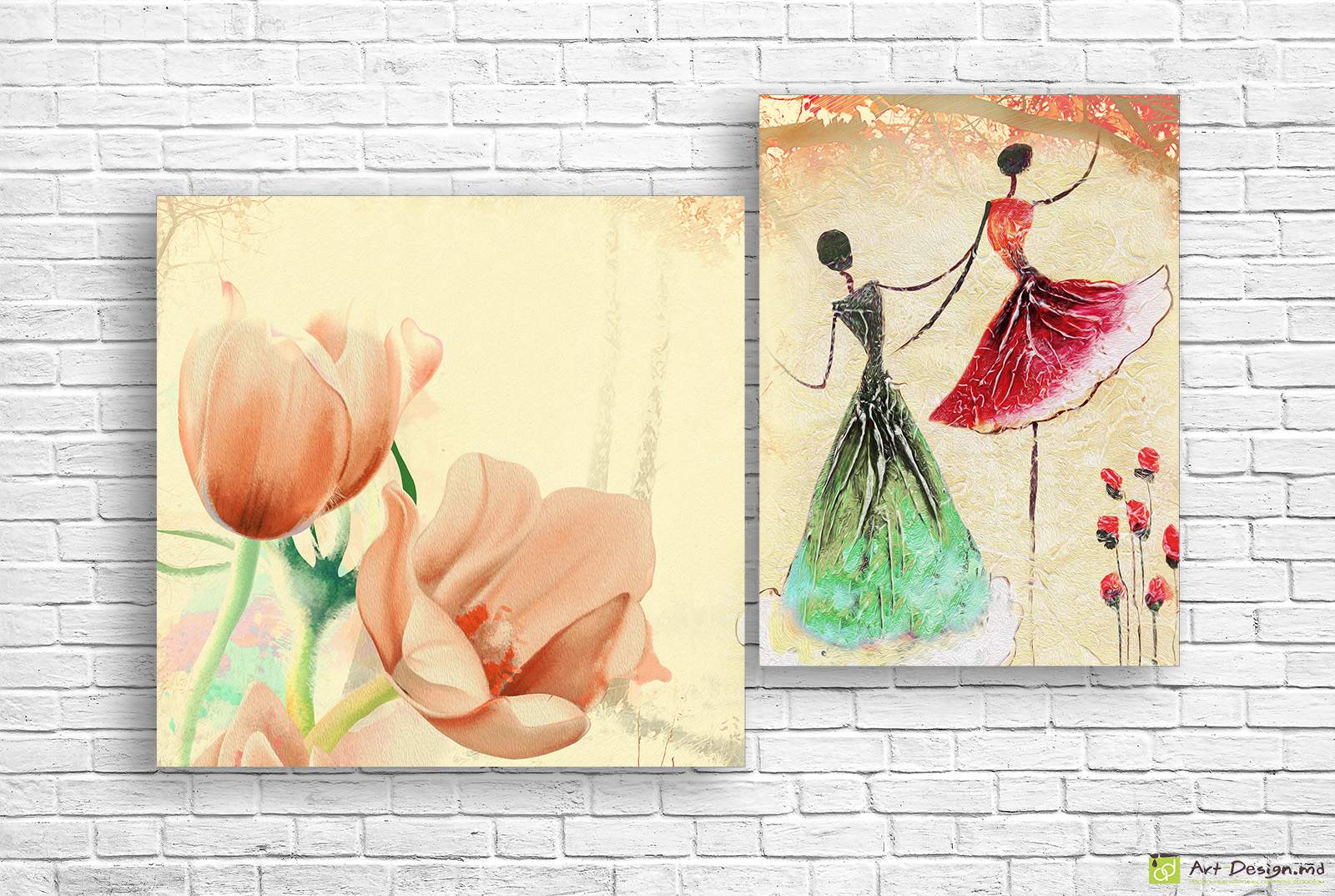 Celălalt panou prezintă figuri stilizate de femei în rochii elegante, realizate într-un stil pictural modern. Paleta caldă de culori și liniile fluide creează un efect decorativ rafinat.