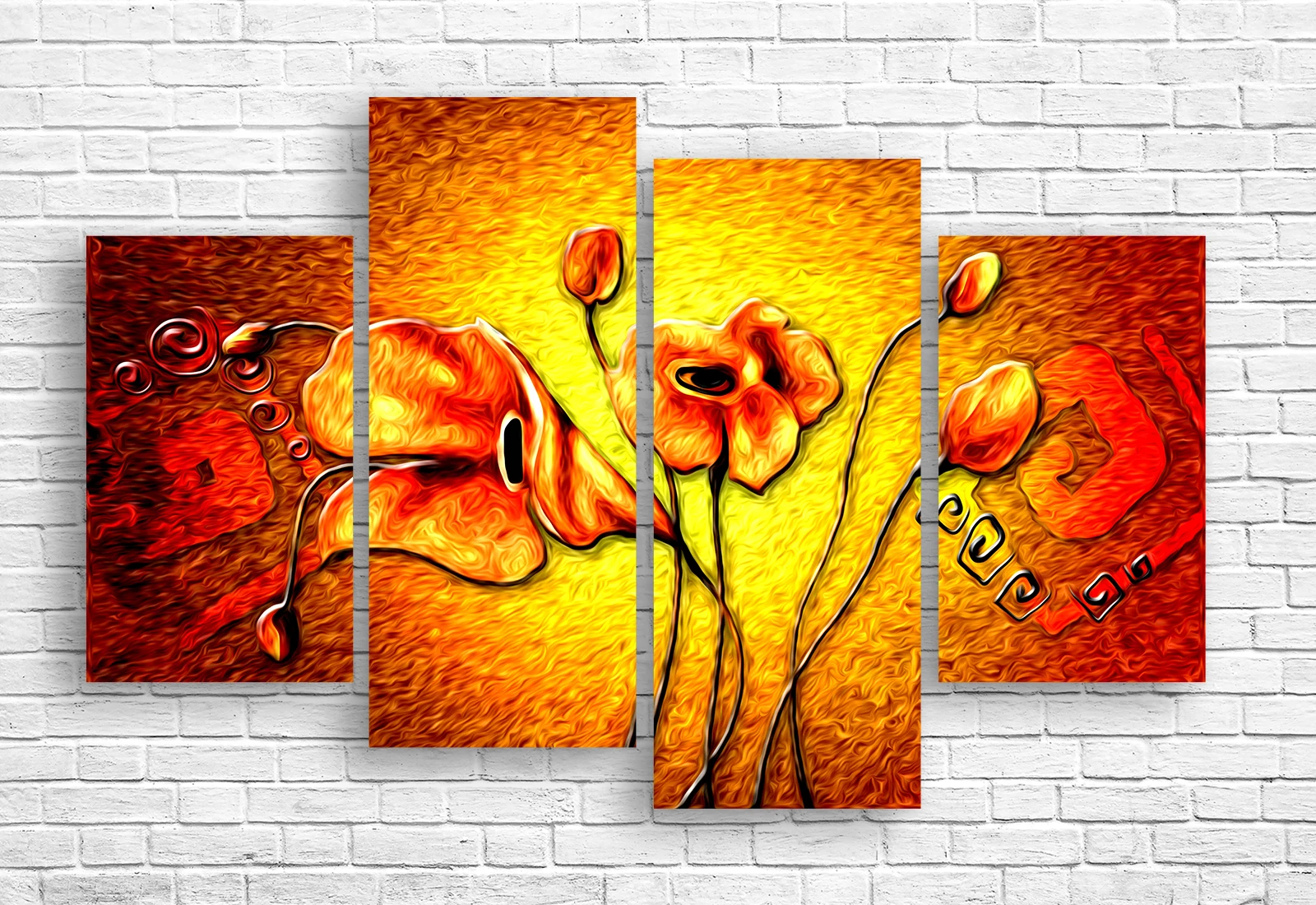 Tabloul modular „Macii aurii” impresionează prin combinația de culori calde și forme florale stilizate. Tonurile intense de galben, portocaliu și roșu aduc lumină și dinamism spațiului.