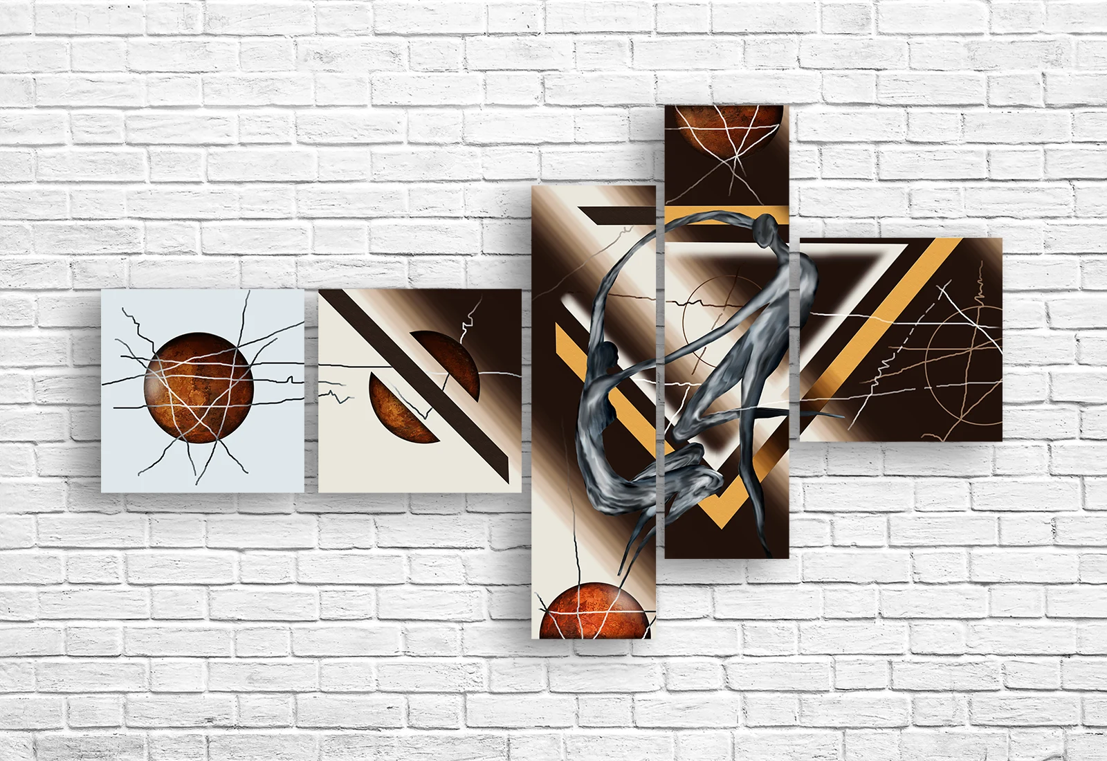 Tabloul modular „Mișcare și formă” este o compoziție artistică modernă ce exprimă dinamismul prin linii abstracte și o figură umană stilizată. Structura pe mai multe panouri creează un efect vizual amplu, sugerând continuitate și echilibru. Paleta cromatică, dominată de nuanțe calde de maro și bej, este completată de accente grafice care oferă profunzime și expresivitate.