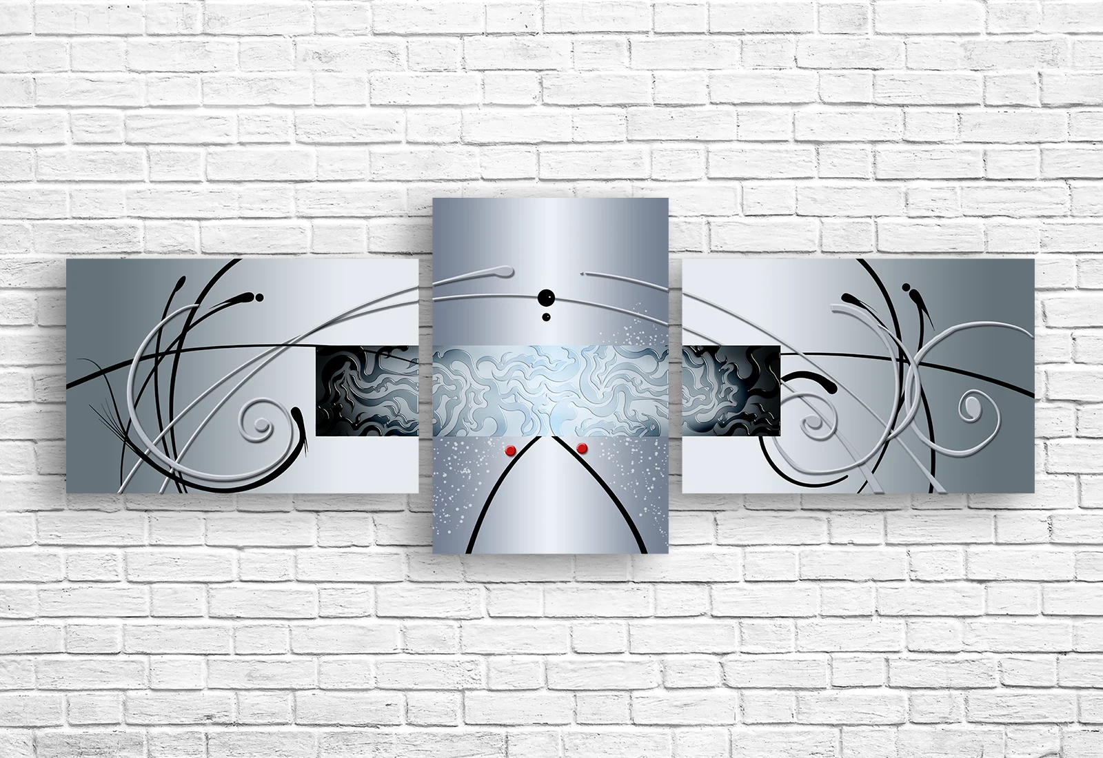 Tabloul modular „Echilibru argintiu” este o compoziție abstractă elegantă, bazată pe armonia liniilor fluide și a formelor grafice într-o paletă argintie rafinată. Jocul subtil dintre suprafețele mate și accentele metalice creează profunzime și echilibru vizual.