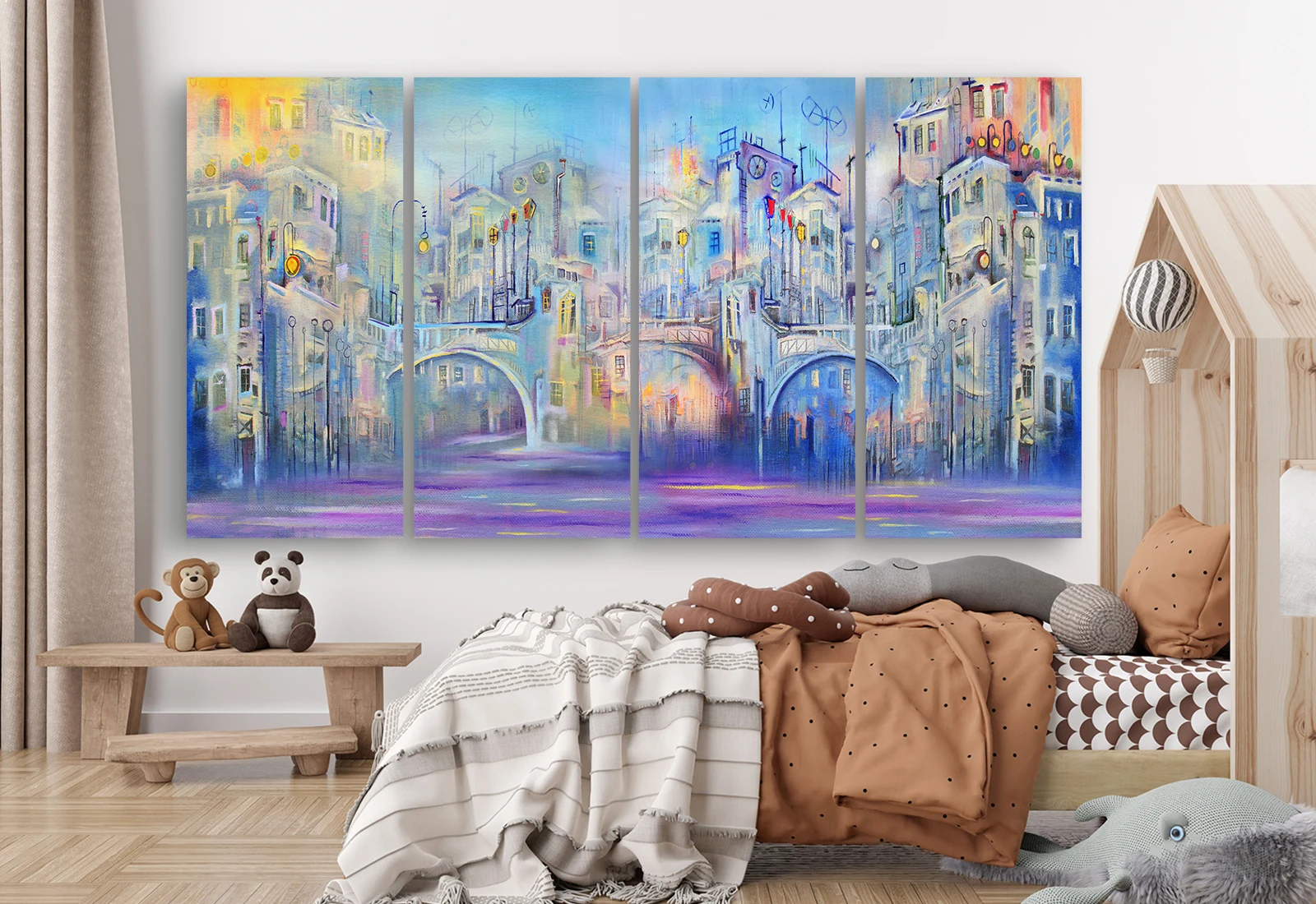 Acest tablou modular prezintă un oraș abstract scăldat în lumini calde, unde liniile arhitecturale delicate și un pod luminos se împletesc armonios. Tonurile pastelate de albastru, mov și crem construiesc o atmosferă calmă, iar reflexiile din apă oferă profunzime și dinamism compoziției. Lucrarea adaugă eleganță și personalitate oricărui spațiu modern, fiind ideală pentru living, dormitor sau birou.