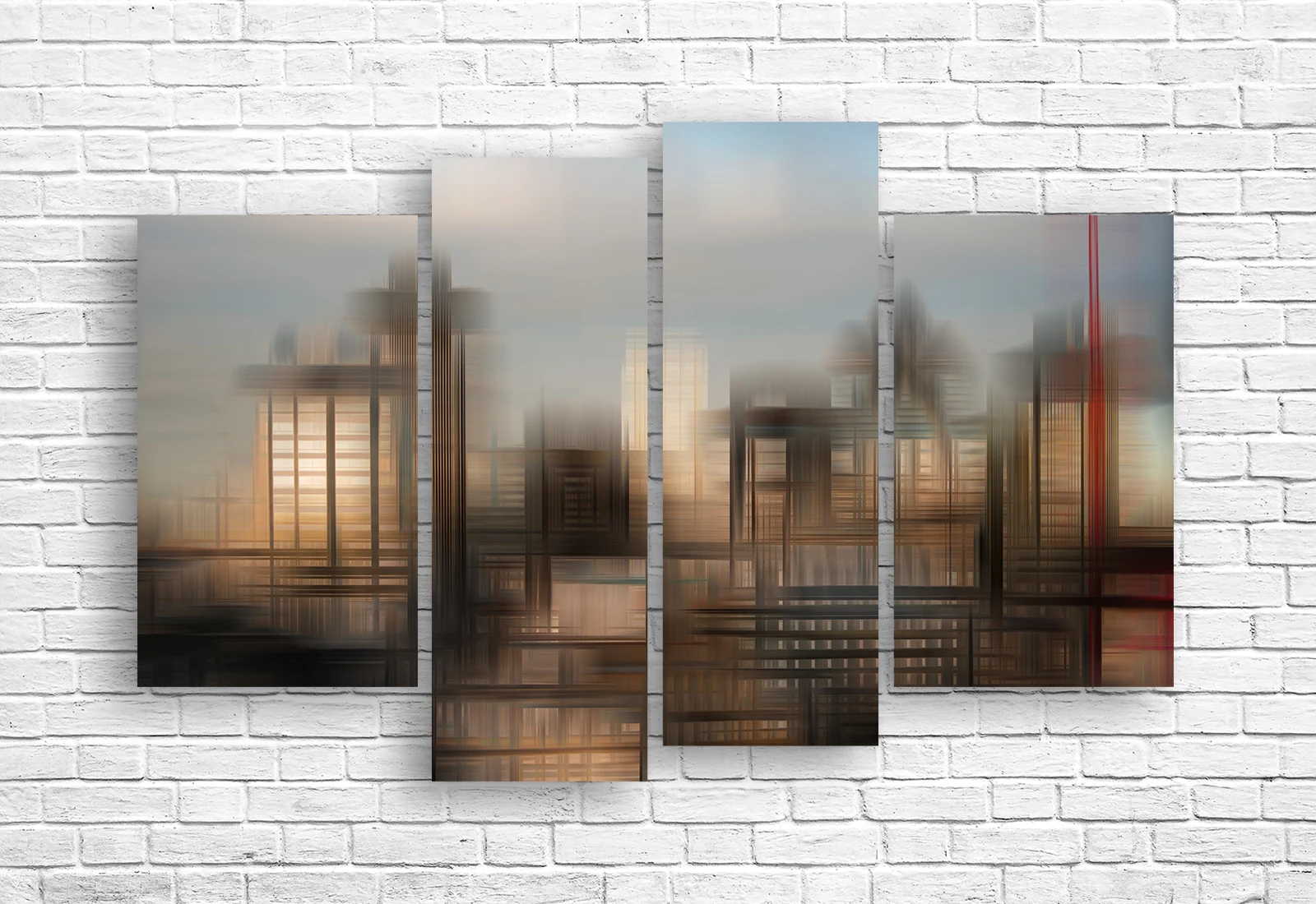 Tabloul modular „Oraș în mișcare” surprinde energia unui oraș modern prin forme abstracte și tranziții vizuale estompate. Siluetele clădirilor par să se dizolve în spațiu, sugerând ritm, dinamică și continuitatea vieții urbane.