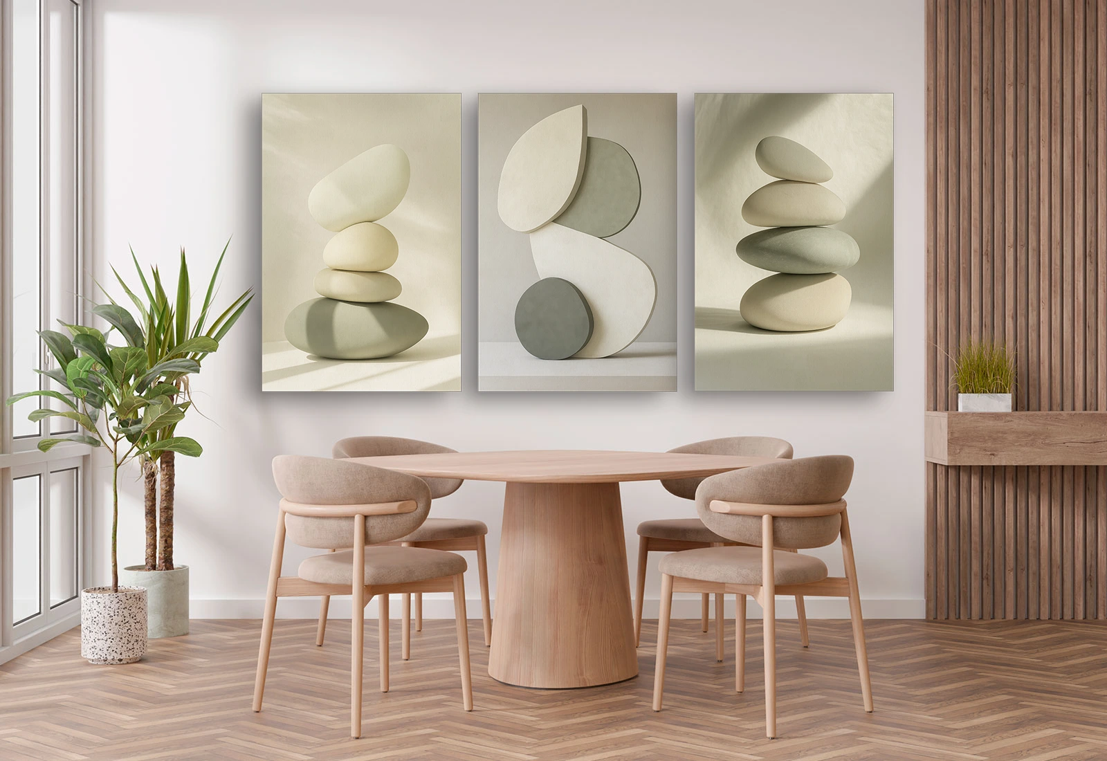 Acest tablou modular minimalist cu forme de pietre stilizate aduce liniște, echilibru și armonie în orice cameră. Ideal pentru un decor inspirat de natură sau stil japonez zen. Culorile neutre și compoziția aerisită transformă spațiul într-un refugiu de calm. Realizat pe pânză de calitate, întinsă pe șasiu din lemn, este perfect pentru dormitor, living sau un colț de meditație modern.