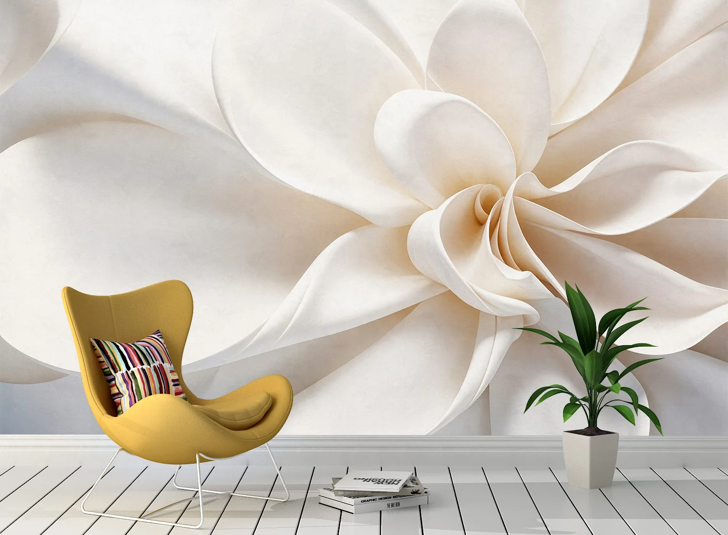 Fototapetul cu floare volumetrică în nuanțe crem adaugă rafinament și căldură oricărui interior. Efectul 3D oferă profunzime peretelui și creează un decor delicat, ideal pentru dormitor, living sau spații de relaxare. Este o alegere perfectă pentru cei care apreciază un stil elegant și natural în amenajarea locuinței.