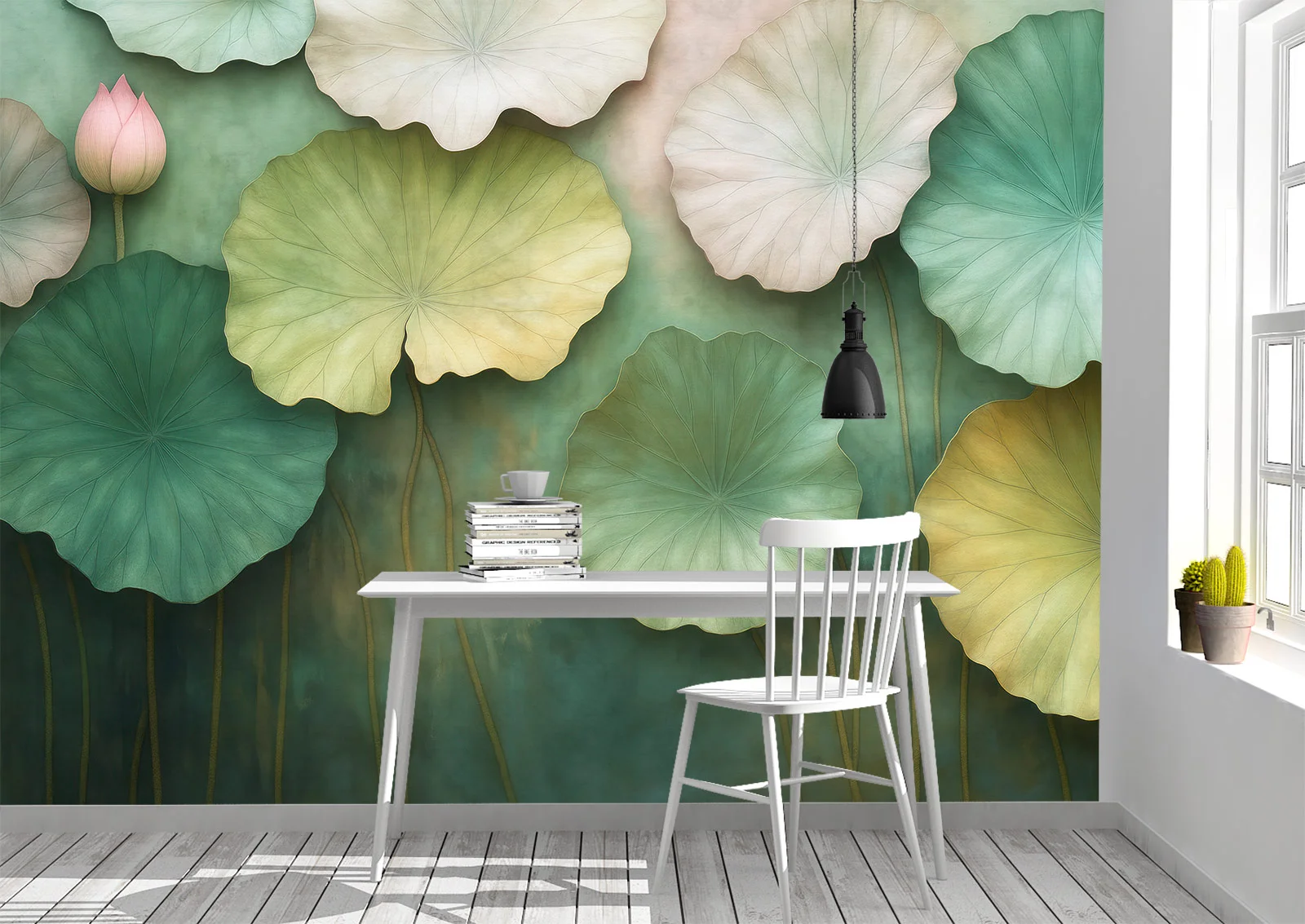 Acest fototapet spectaculos cu frunze de lotus în nuanțe verzi și galbene, completate de o floare roz delicată, aduce un colț de natură calmă și elegantă în interiorul casei tale. Designul artistic creează un efect vizual de profunzime, inspirând echilibru și relaxare. Este alegerea ideală pentru un birou creativ, un living aerisit sau un dormitor liniștit. Potrivit stilurilor moderne, naturale sau japandi, acest decor aduce armonie prin fiecare detaliu.