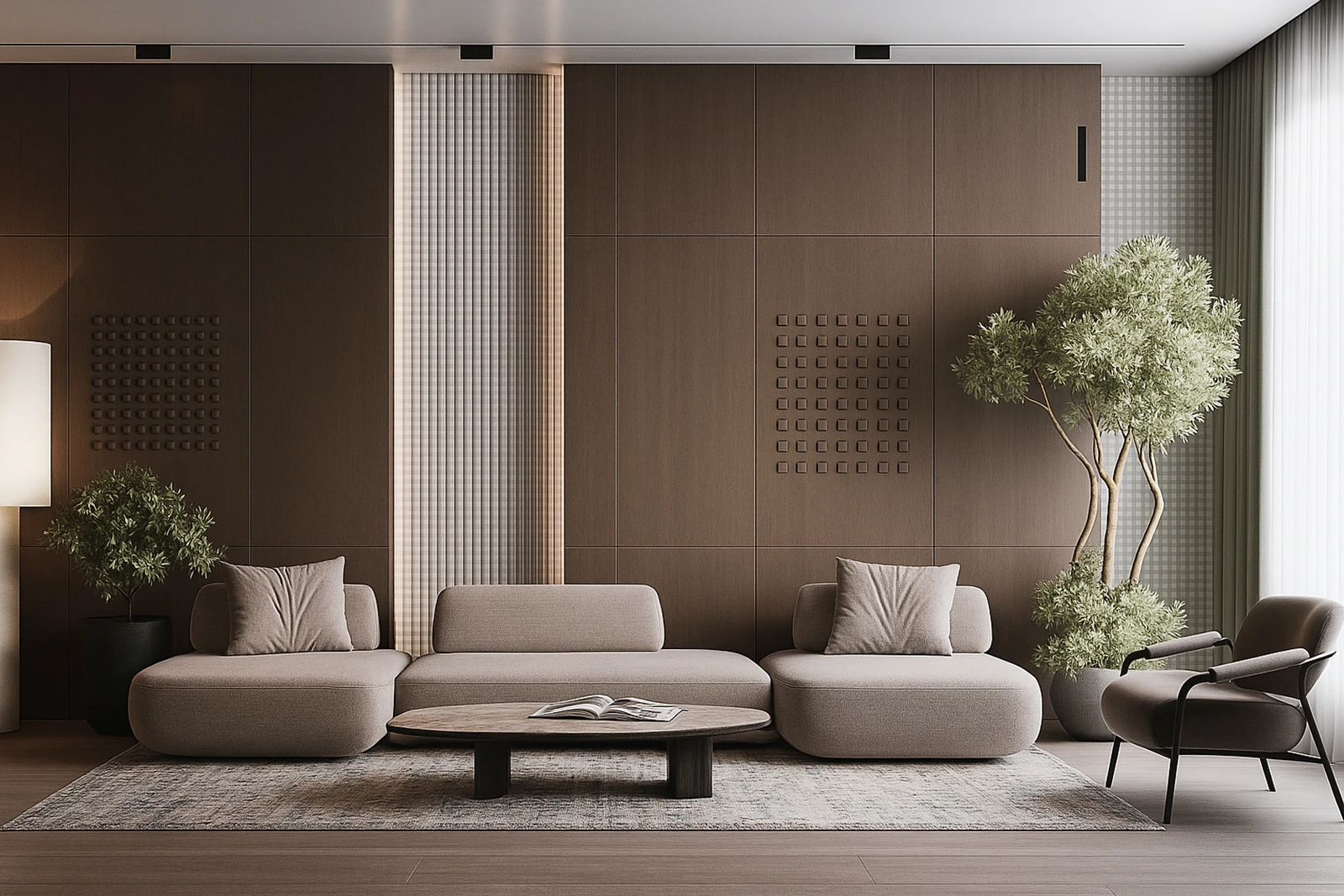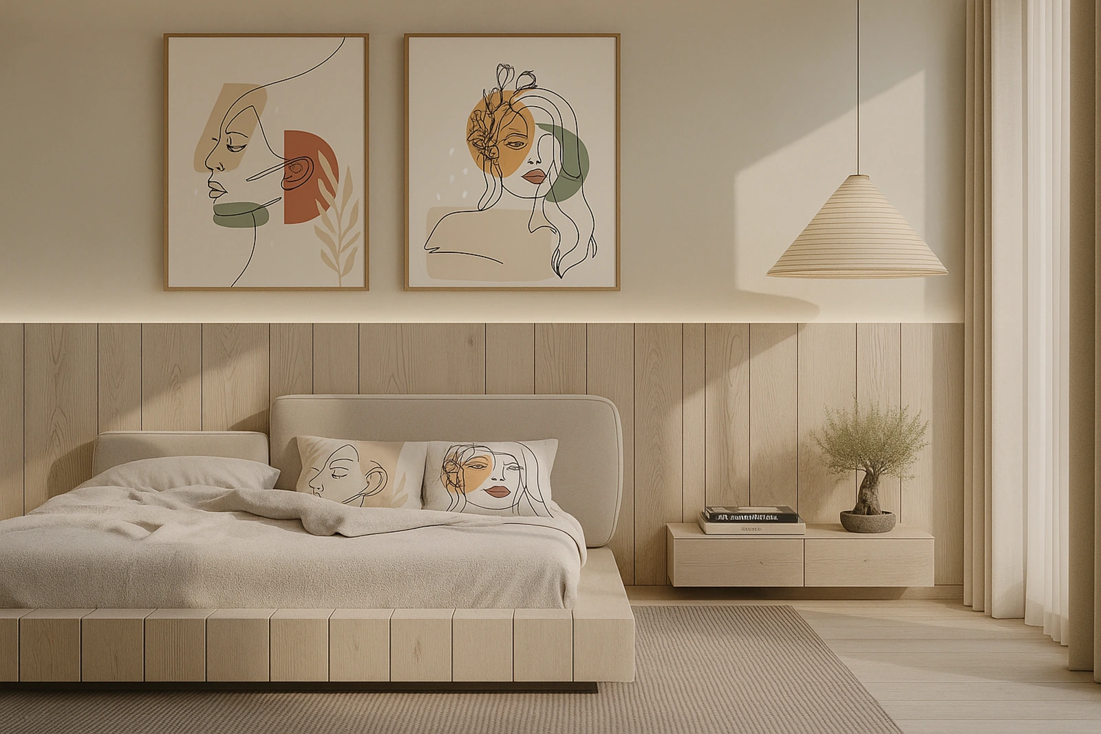 Pereții pot fi finisați cu tapet monocromatic, fototapet minimalist cu linii simple, textură de tencuială, cărămidă sau panouri din lemn.