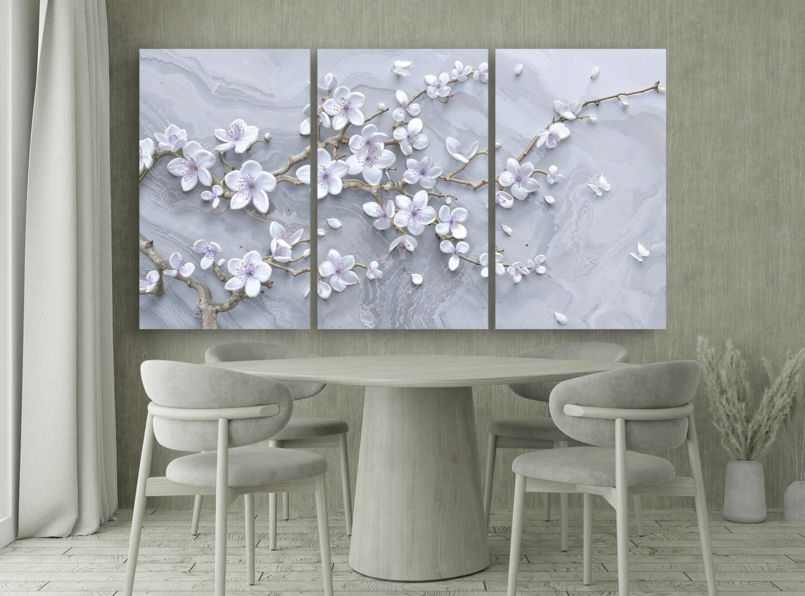 Tabloul modular cu flori albe pe un fundal gri cu aspect de marmură aduce eleganță și calm oricărui spațiu. Este perfect pentru living sau dormitor, completând cu bun gust stilul modern al casei tale.