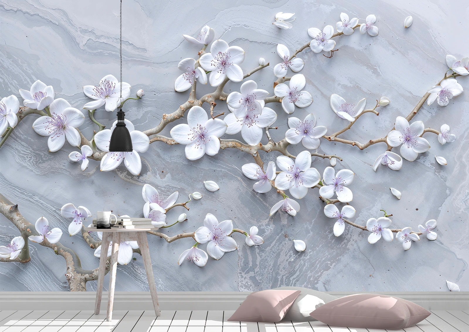 Fototapetul cu flori albe de cireș japonez aduce un aer proaspăt și elegant. Ideal pentru living, dormitor sau birou, oferind armonie și un plus de frumusețe decorului. Acest tip de tapet decorativ este perfect pentru a transforma orice spațiu interior într-o oază de liniște și rafinament.