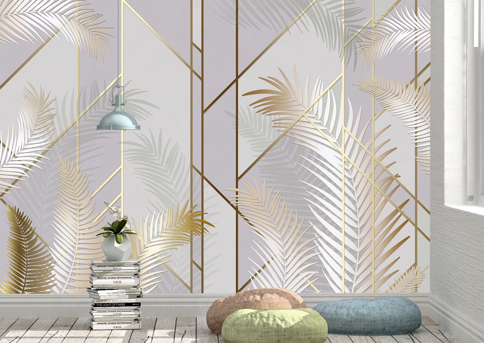 Acest fototapet cu frunze aurii de palmier pe un fundal gri-liliachiu adaugă o notă de eleganță și rafinament în orice încăpere. Modelele geometrice fine și tonurile calde creează un efect vizual sofisticat, potrivit atât pentru living, cât și pentru dormitor. Textura detaliată și culorile armonioase oferă un aer modern și primitor, integrându-se perfect în decoruri contemporane sau clasice. Ideal pentru a transforma pereții într-o veritabilă operă de artă.