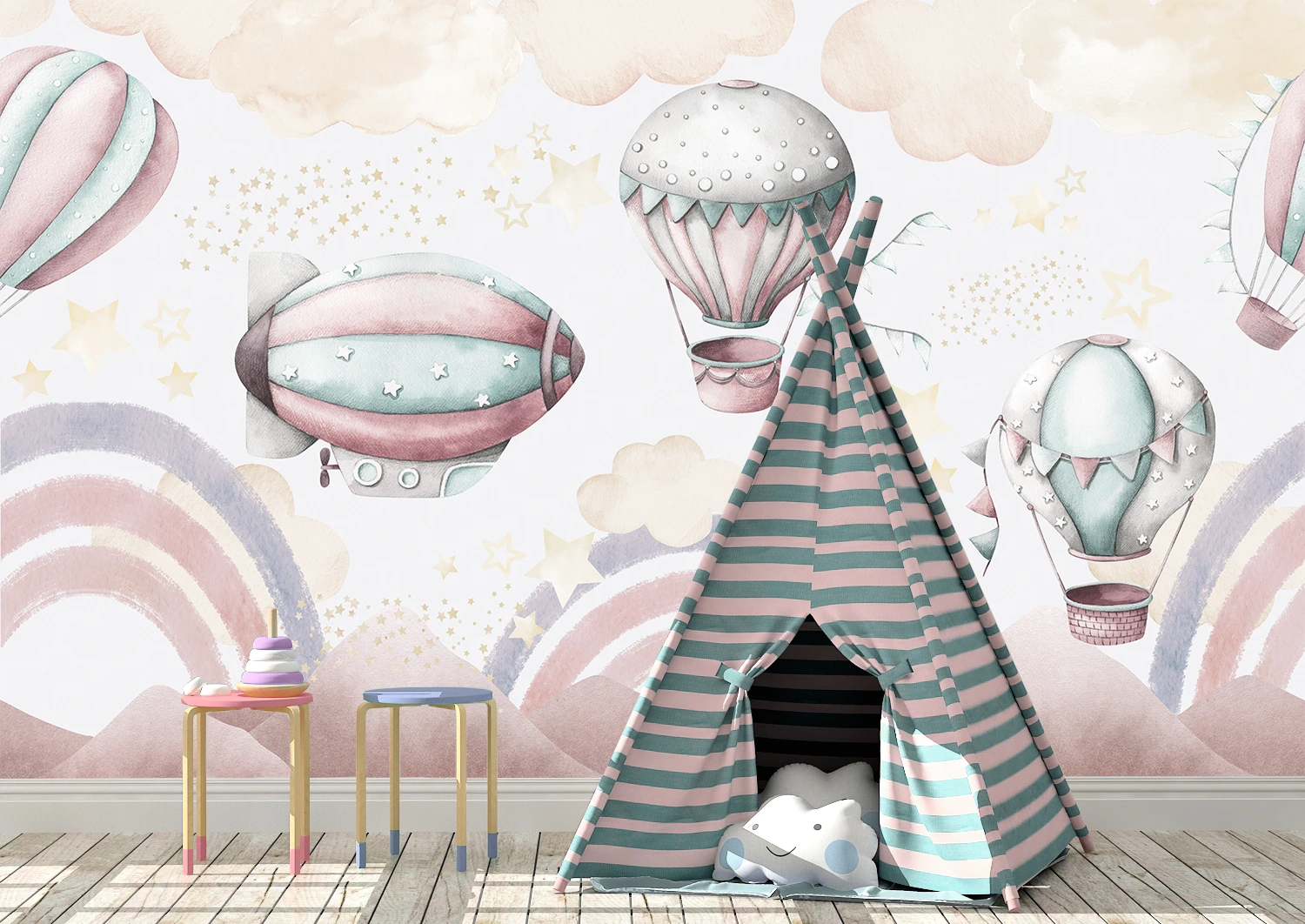 ✅ Fototapet copii cu baloane pastel roz-verde și curcubeu acuarelă. ✓ Decor jucăuș și delicat pentru camera copilului. 🚚 Livrare Chișinău. ⭐ Art-Design.md